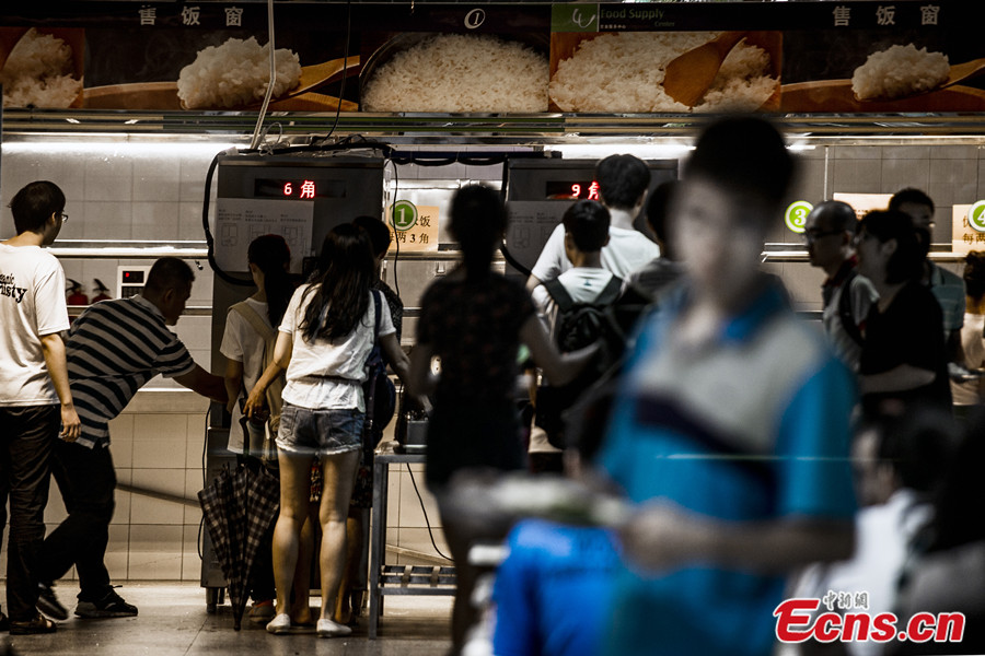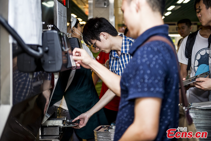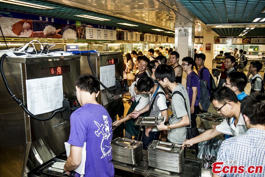 Students queue up to take cooked rice from a ‘steamed rice vending machine,’ which is newly introduced by canteen of the South China University of Technology in Guangzhou, Guangdong province on June 11, 2014. By placing dishes under the machine and swiping card to pay for the meal, the device can offer cooked rice automatically. [Photo: China News Service / Long Yuyang]