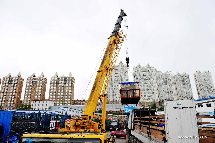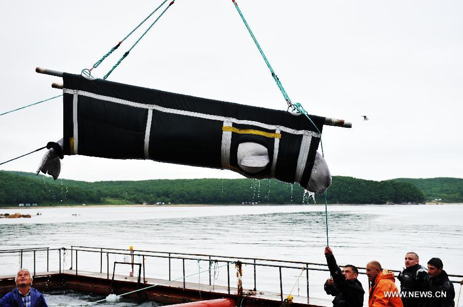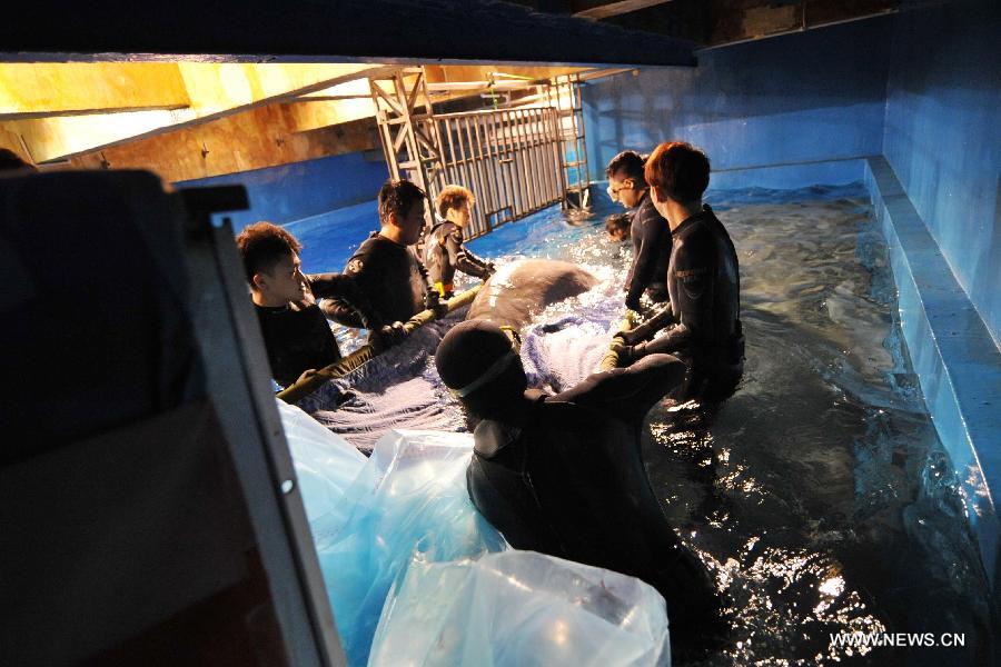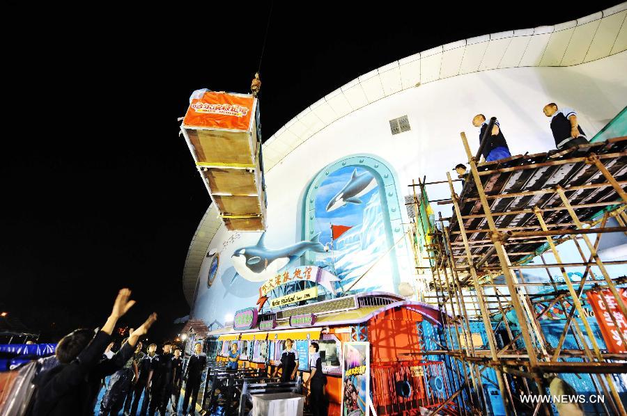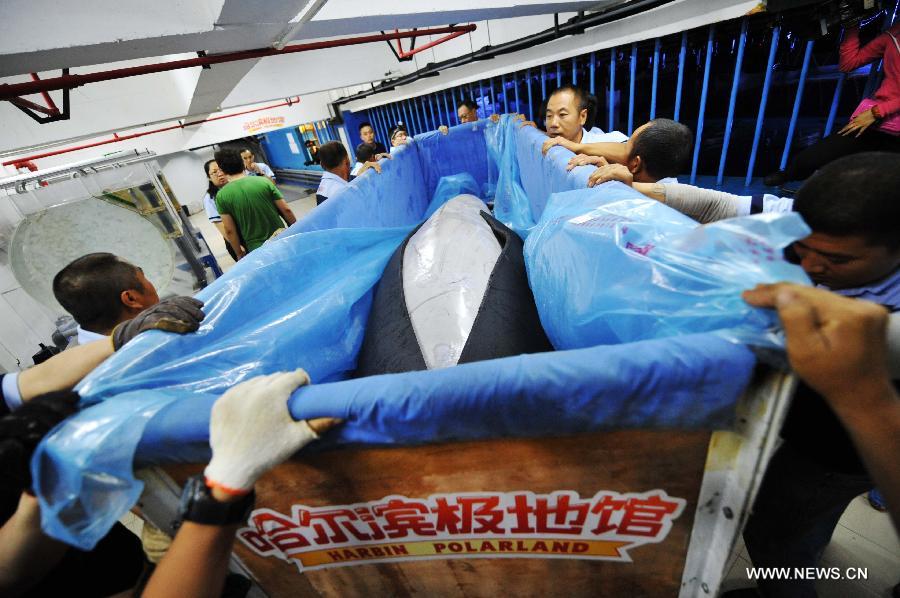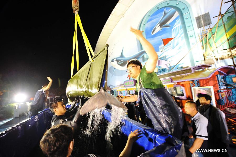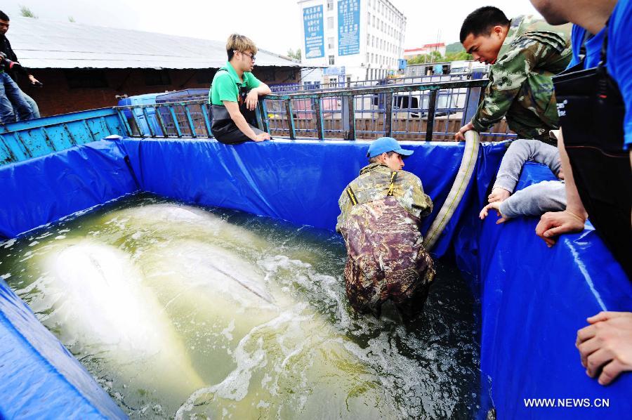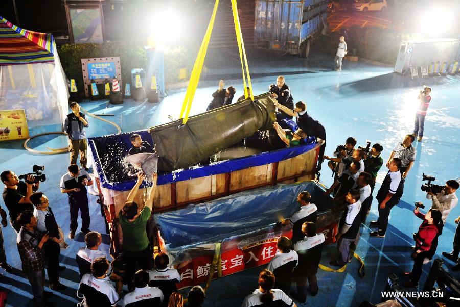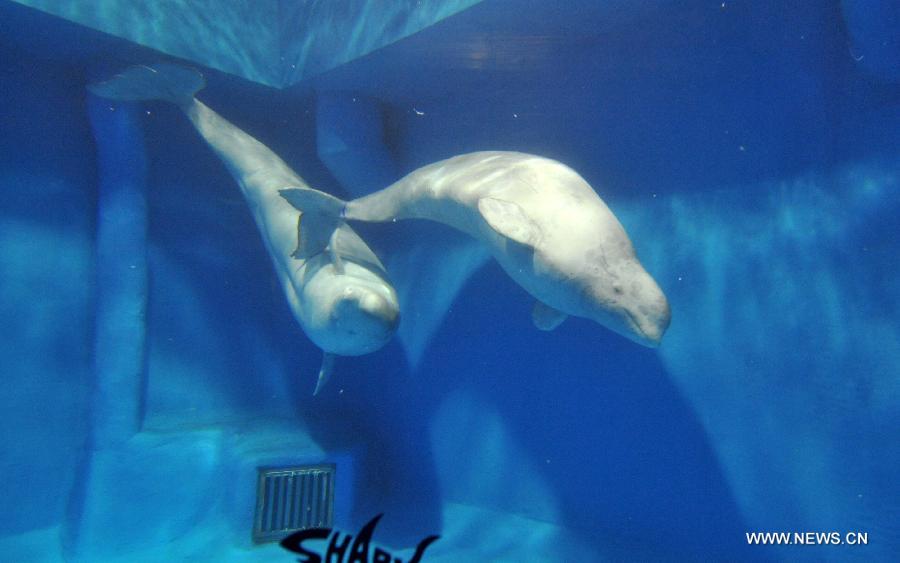 Two beluga whales swim at the Harbin Polarland theme park in Harbin, capital of northeast China's Heilongjiang Province, June 11, 2014. After 20-hour's drive, three white whales from Russia on Wednesday were transported to the park. (Xinhua/Wang Jianwei)