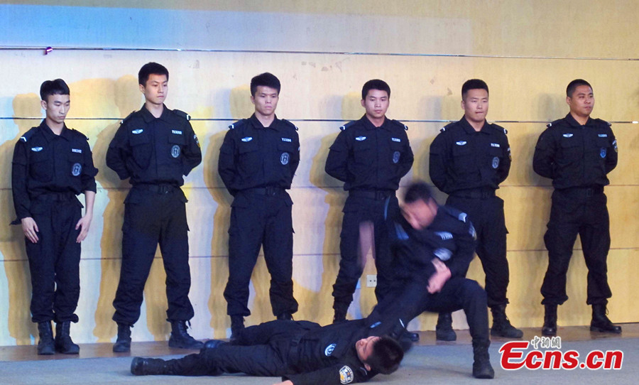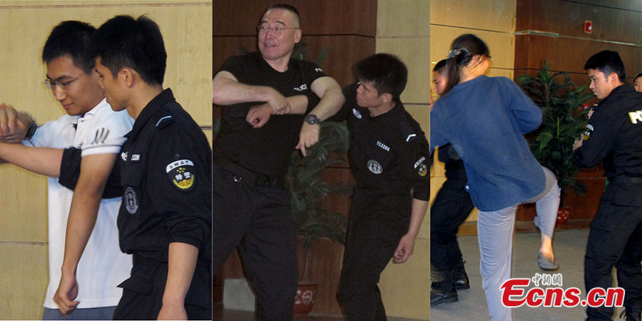 Police officers demonstrate actual combat skills during a lecture featuring techniques in defending against terror attack at the Capital University of Economics and Business in Beijing, June 11, 2014. [Photo: China News Service / Ren Haiyan]