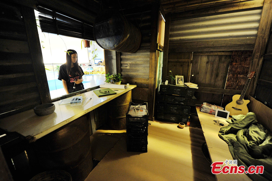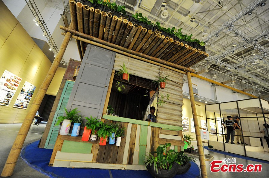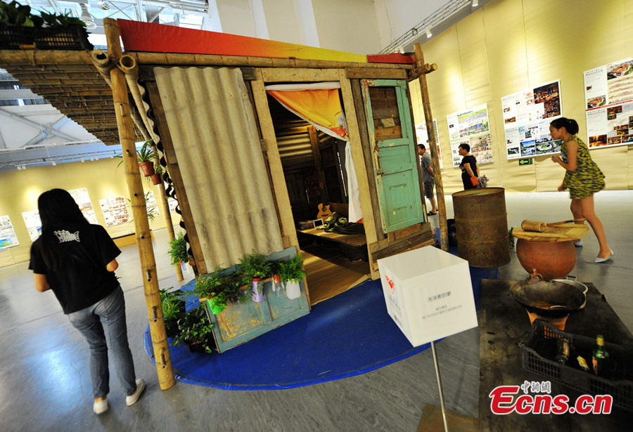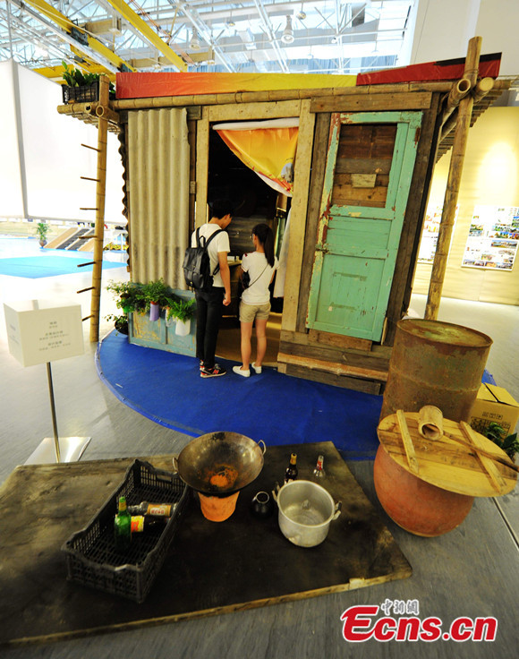 A hut, designed for vagabonds, is displayed at an exhibition in Xiamen of Fujian province on June 12, 2014. The environment-friendly hut is made of recycled wastes, such as obsolete doors, waste tiles and rusted oil drums, which are all reachable for the special vulnerable group. [Photo: China News Service / Zhang Bin]