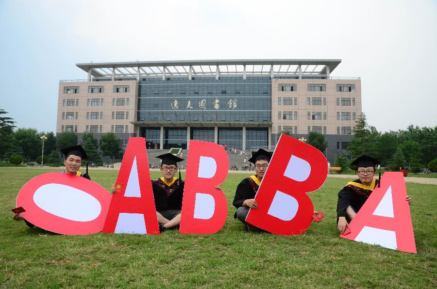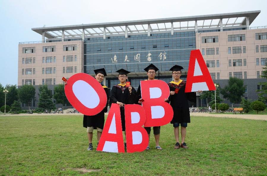 Students from Liaocheng University in east China's Shandong Province shoot creative graduation photos to greet World Blood Donor Day on June 13, 2014. (Xinhua/Zhao Yuguo)