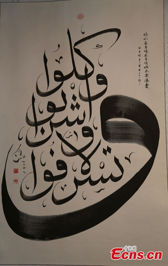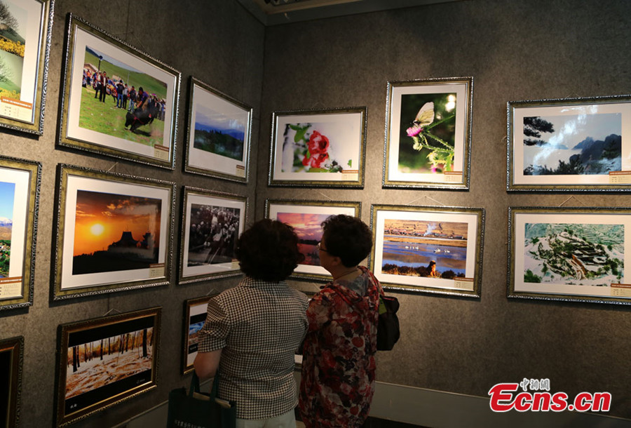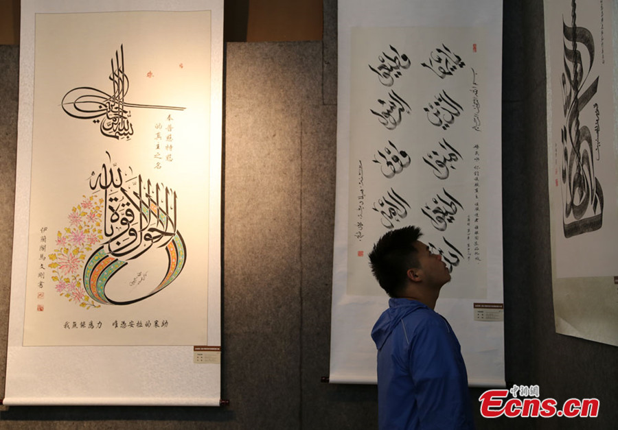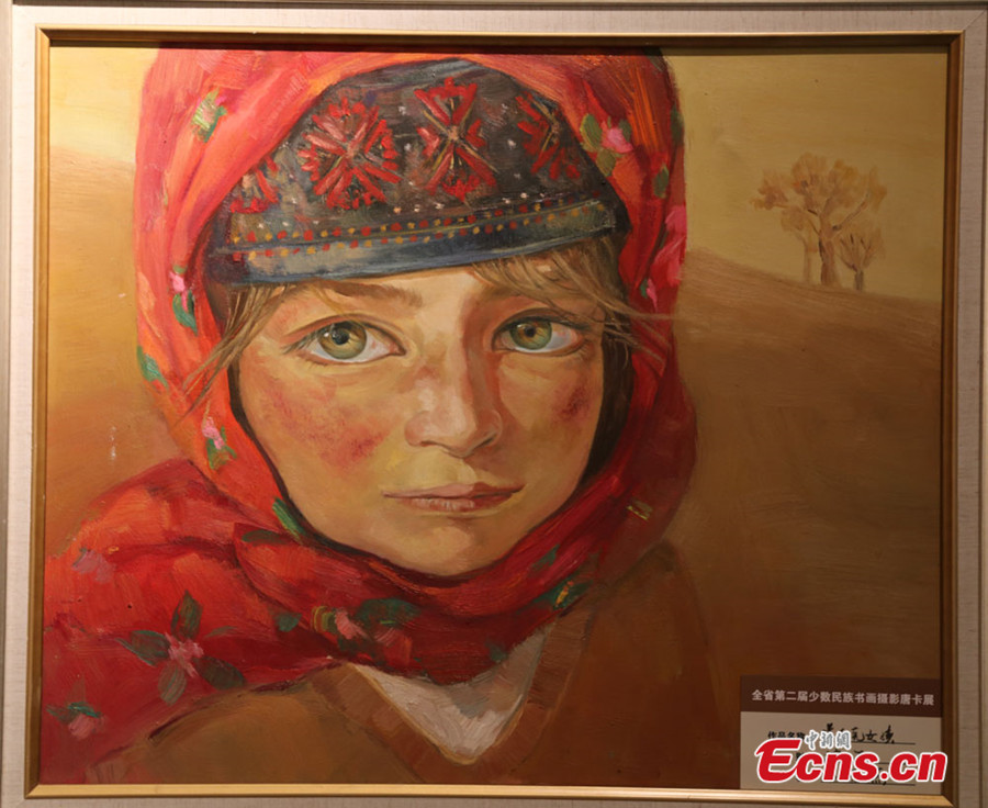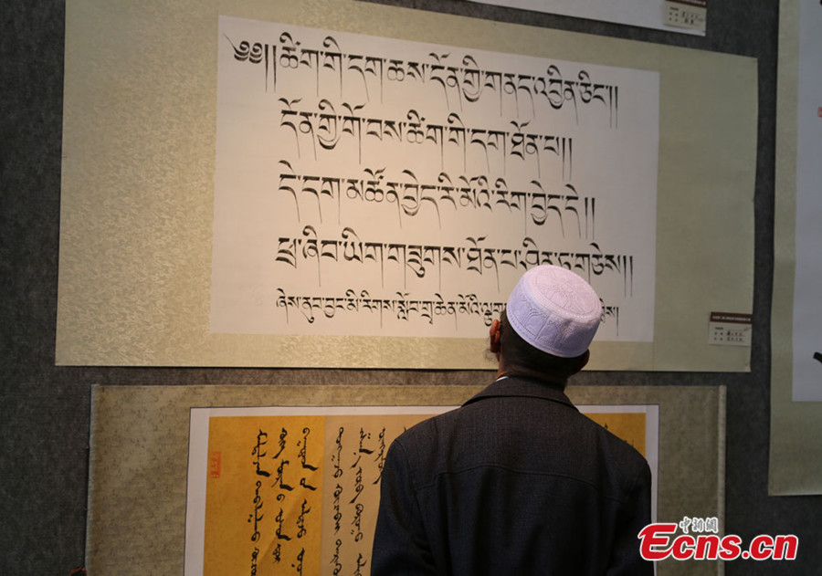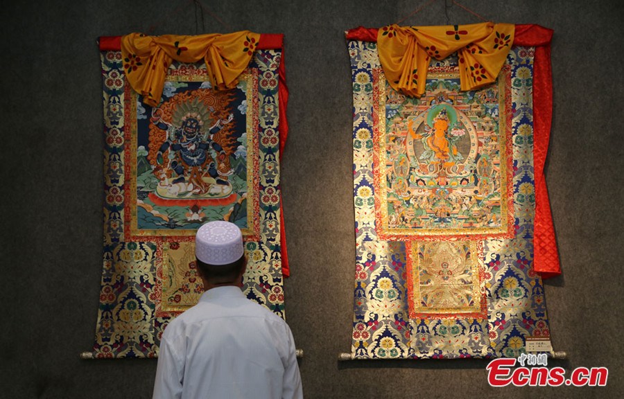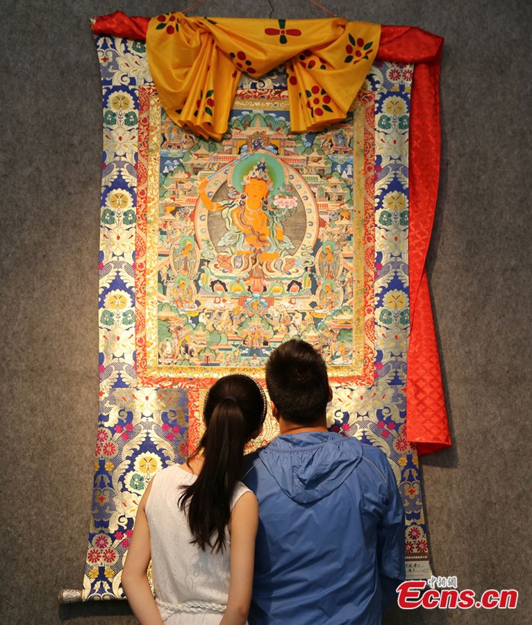 A visitor views a Thangka painting shown at a Chinese ethnic art exhibition featuring works of painting, calligraphy, photography and Thangka opened in Lanzhou, Gansu province on June 15, 2014. Being jointly organized by the Gansu Ethnic Affair Commission, the provincial artists association of Gansu, and the society of Muslim painting, calligraphy, and photography of Gansu province, the exhibition has collected over 600 works from 250 artists of 12 Chinese ethnic minority groups including the Hui nationality, Tibetan nationality, and the Bouyei nationality.[Photo / Ding Si]