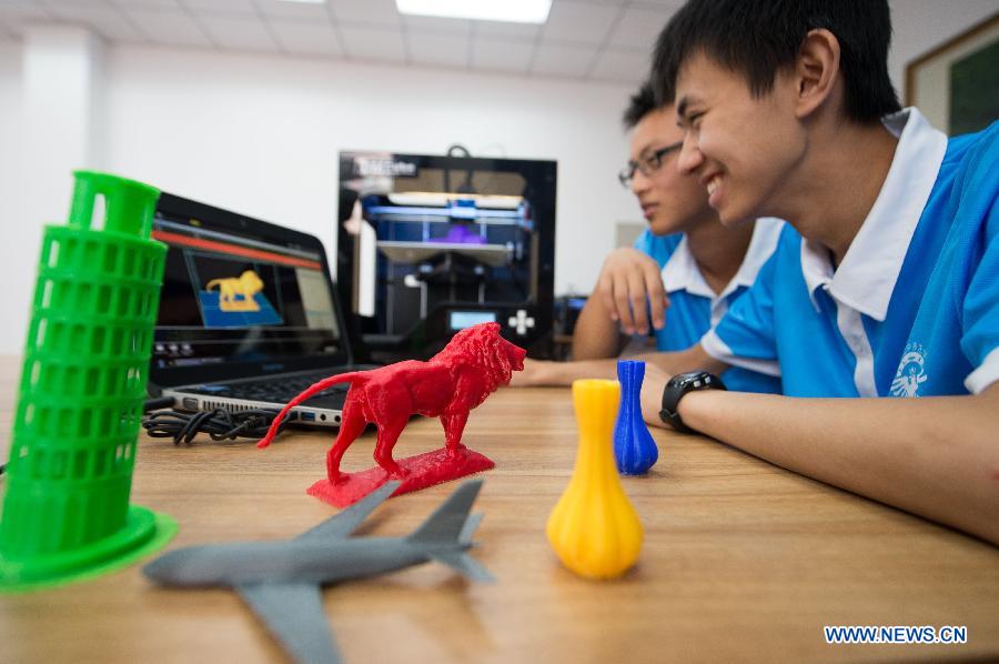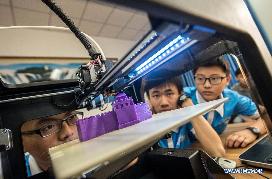Students view a 3D printer at the 3D LAB in Beijing No. 2 Middle School Yizhuang School, in Beijing, capital of China, June 16, 2014. A total of 10 DM Cube desktop 3D printers were donated to this school Monday. (Xinhua/Zhang Yu)
