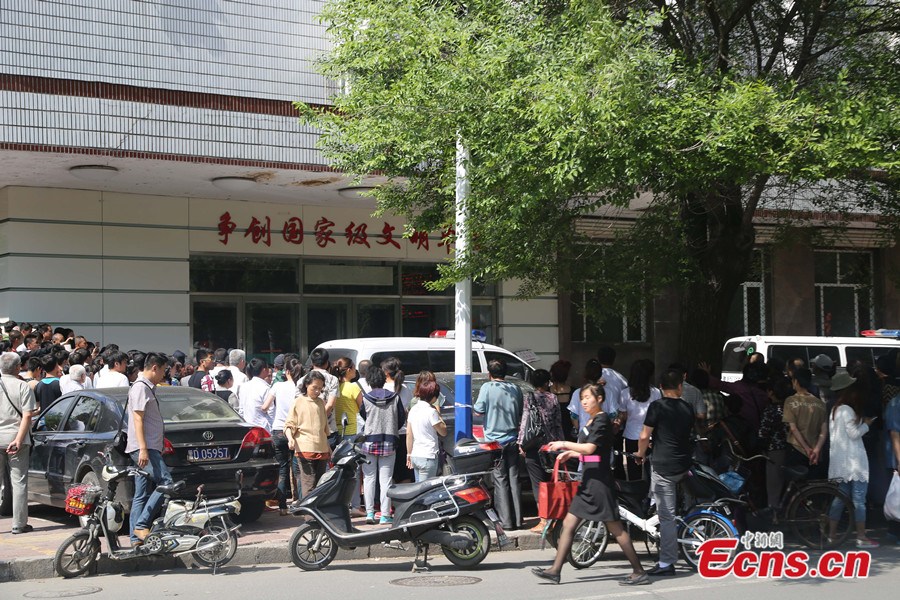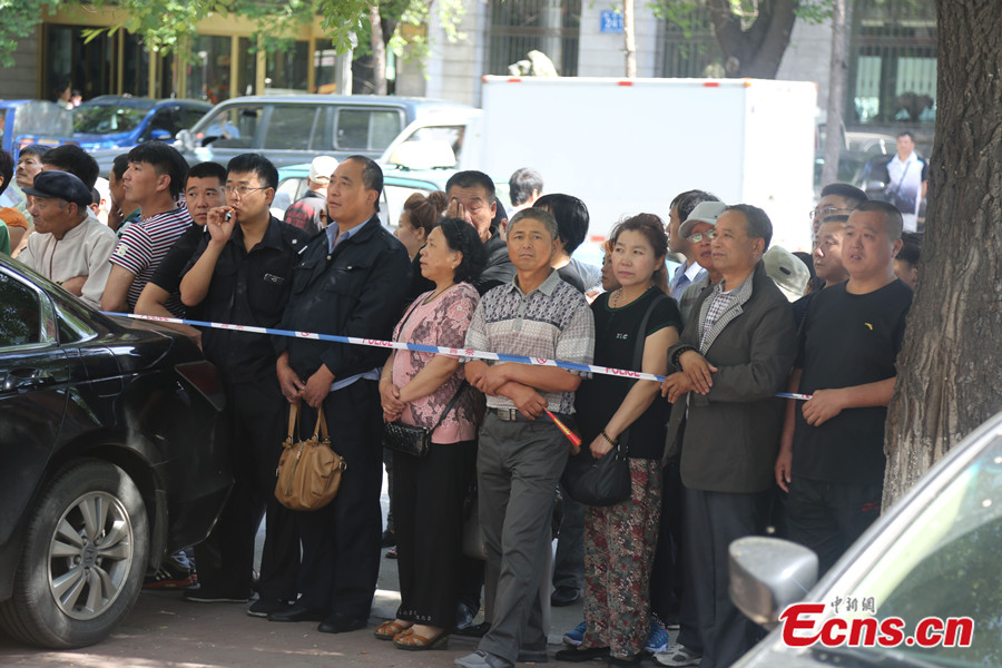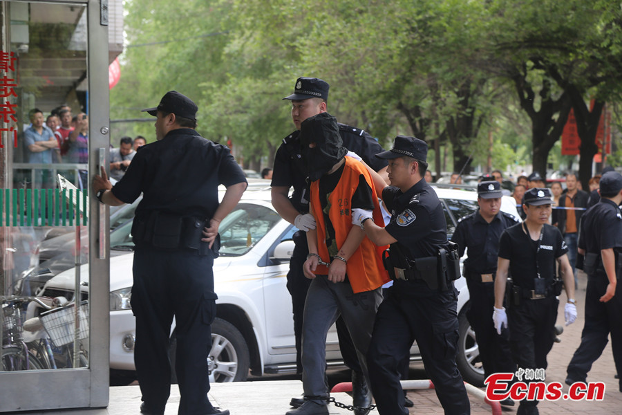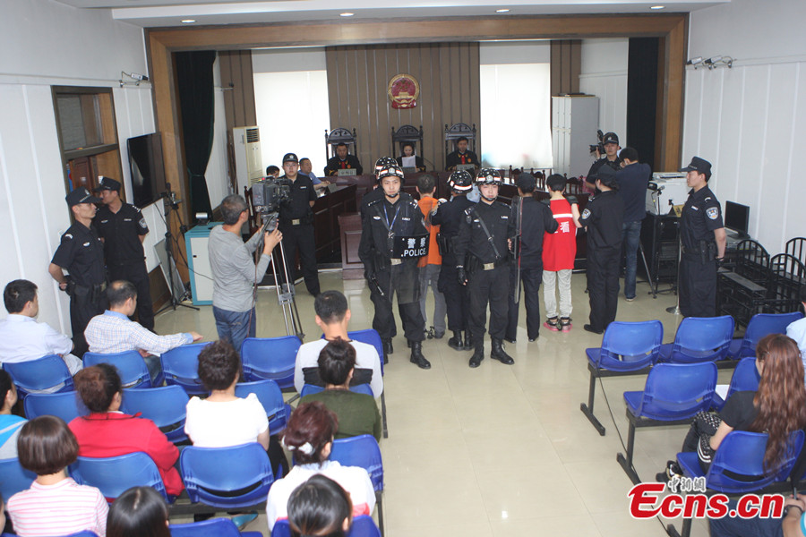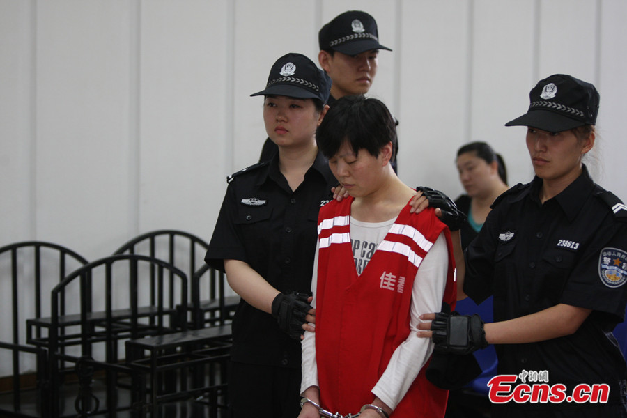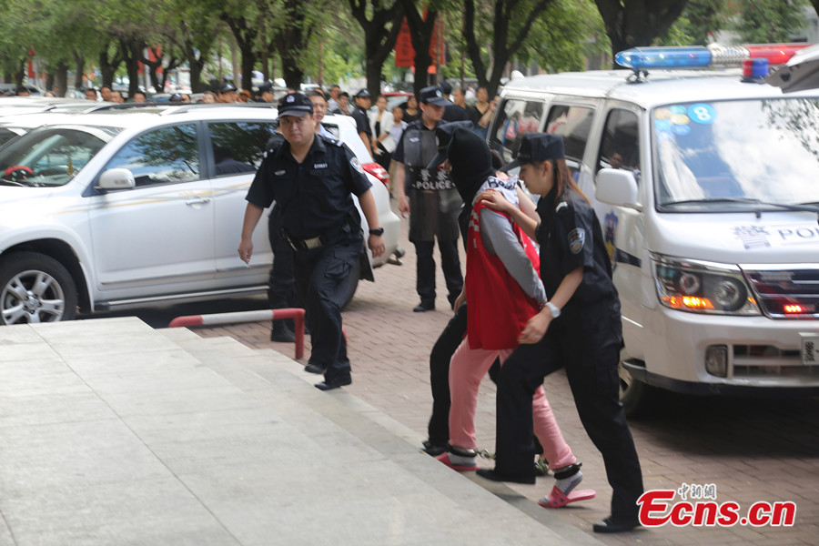 The Jiamusi Intermediate People's Court of northeast China's Heilongjiang province sentenced Bai Yunjiang and her wife Tan Beibei to death and life imprisonment respectively in a rape and murder case on Monday, June 16, 2014. The couple lured a teenager to their house, raped and killed her last July. Tan, who was pregnant at the time of the murder, gave birth to a boy on August 6, 2013. The child has been sent to a local welfare center, after the couple and their relatives gave up custody. Photo taken on June 16, 2014 shows Bai Yunjiang(R2) and Tan Beibei(L2) stand on trial at the Jiamusi Intermediate People's Court. [Photo: China News Service / Zhong Xin]