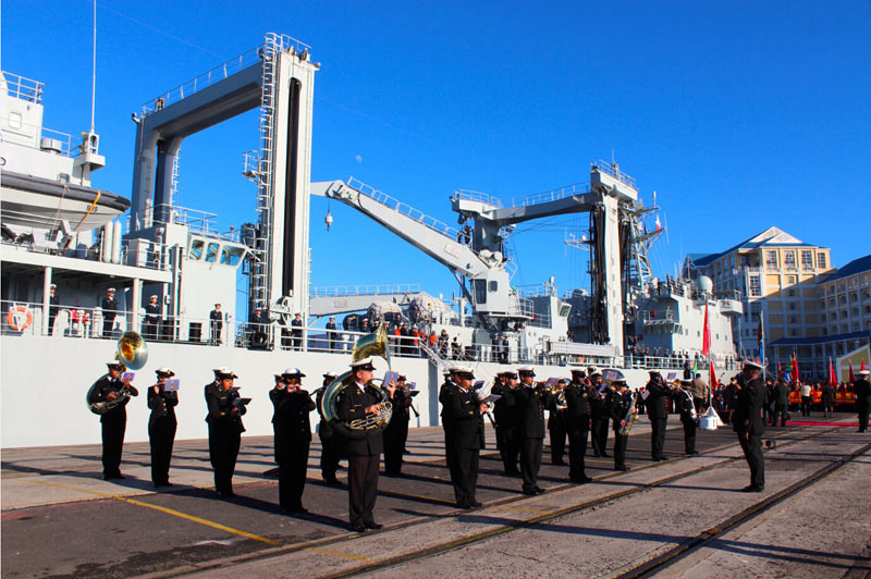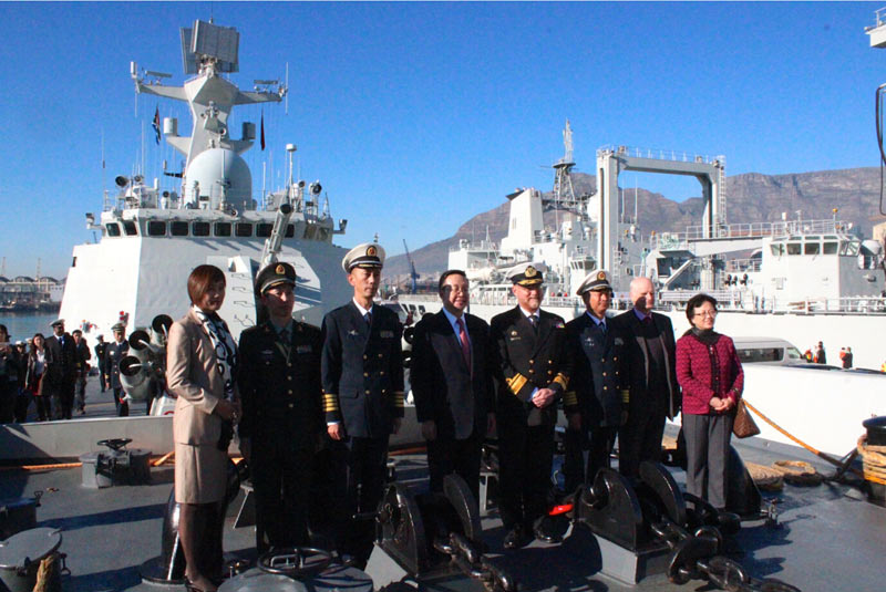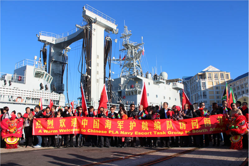 The warships were welcomed by a cheering crowd of people at the port. Among them were Chinese Ambassador Tian Xuejun, high-ranking South African navy officers, and oversea Chinese in South Africa.