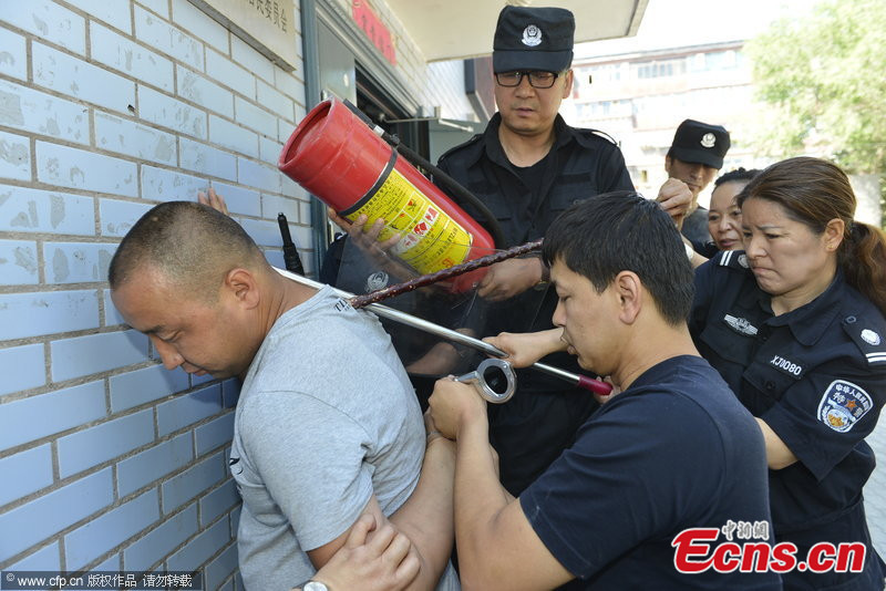 Participants playing the role of knife-wielding attackers in a simulation exercise at the entrance of a neighborhood committee, clash with other participants playing the role of police and community staff, in Urumchi of Xinjiang Uygur autonomous region on June 18, 2014. The drill is launched at a residential community of the city’s Saybagh district, and it is designed to train people how to act promptly against a terrorist attack, and use everything around them as a weapon. [Photo/ CFP]
