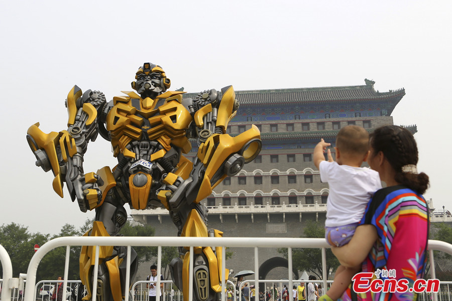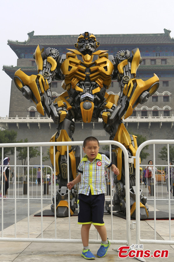 A film prop of “Bumblebee,” a fictional character from “Transformers” movies is shown on the Qianmen Street in Beijing on June 19, 2014. [Photo: China News Service/ Li Huisi]