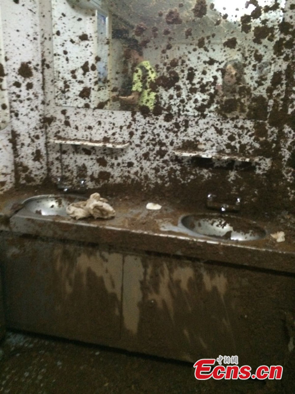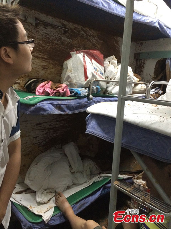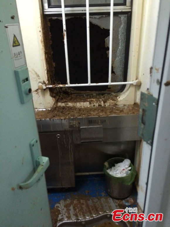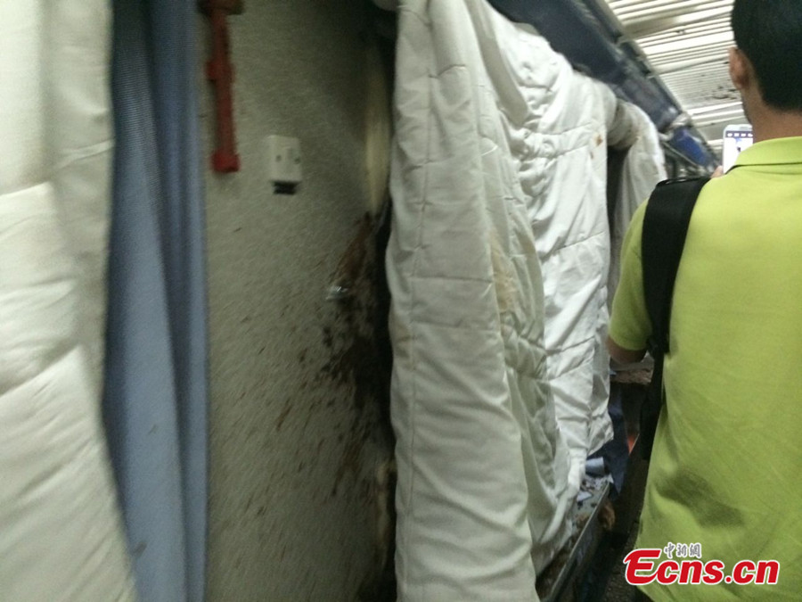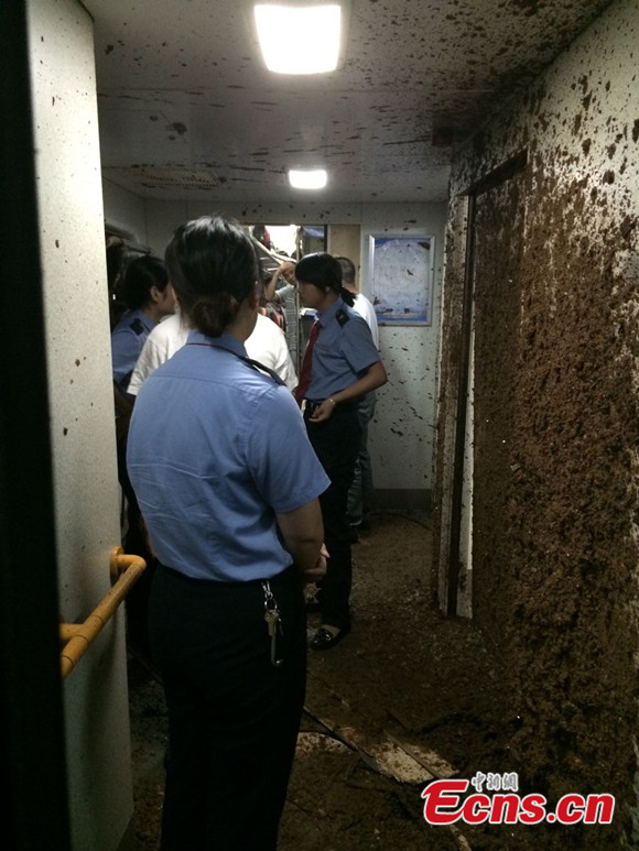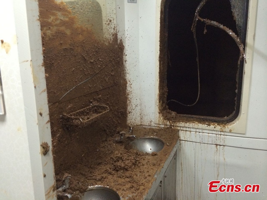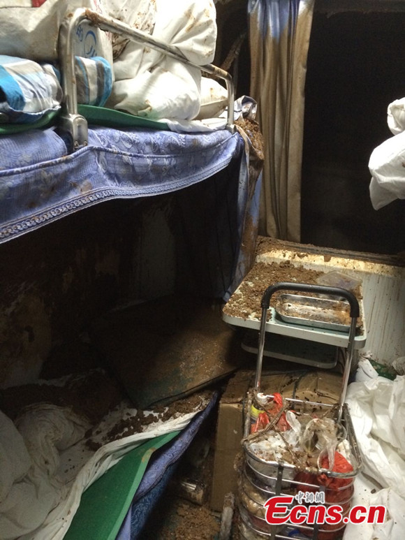 The T171 Nanchang-Guangzhou railway train encountered a rain-triggered landslide near Qingyuan City in south China's Guangdong Province at about 5 a.m. on Thursday, June 19, 2014. The 12th carriage of the train derailed, injuring five passengers. The railway was suspended immediately after the accident but resumed operation at around 12:02 p.m.. [Photo: China News Service / Yin Haiming]