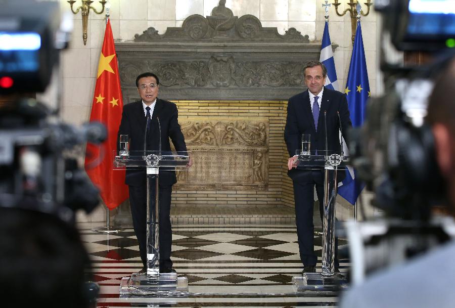 Chinese Premier Li Keqiang (L) and Greek Prime Minister Antonis Samaras hold a joint press conference after their talks in Athens, Greece, June 19, 2014. (Xinhua/Pang Xinglei)