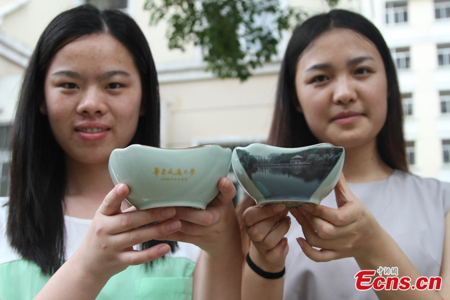 A student of East China Jiaotong University in Nanchang, Jiangxi province shows her graduation gift—a porcelain bowl granted by the school on June 19, 2014. The university gives porcelain bowls marked with the painting of the school’s landscape to its 5,300 graduates this year. The move has caused uproar among the country’s netizens who say the gift looks like a begging bowl. [Photo/ Jiang Tao]