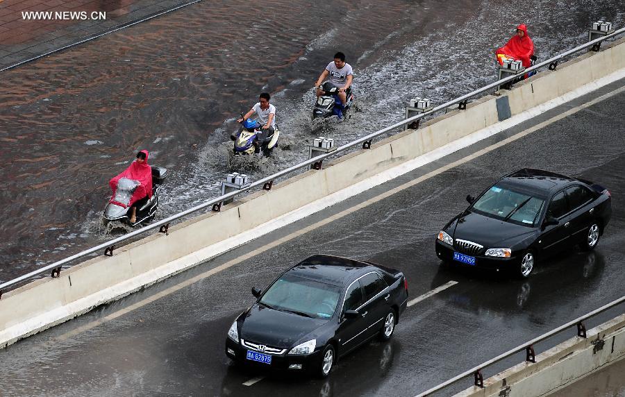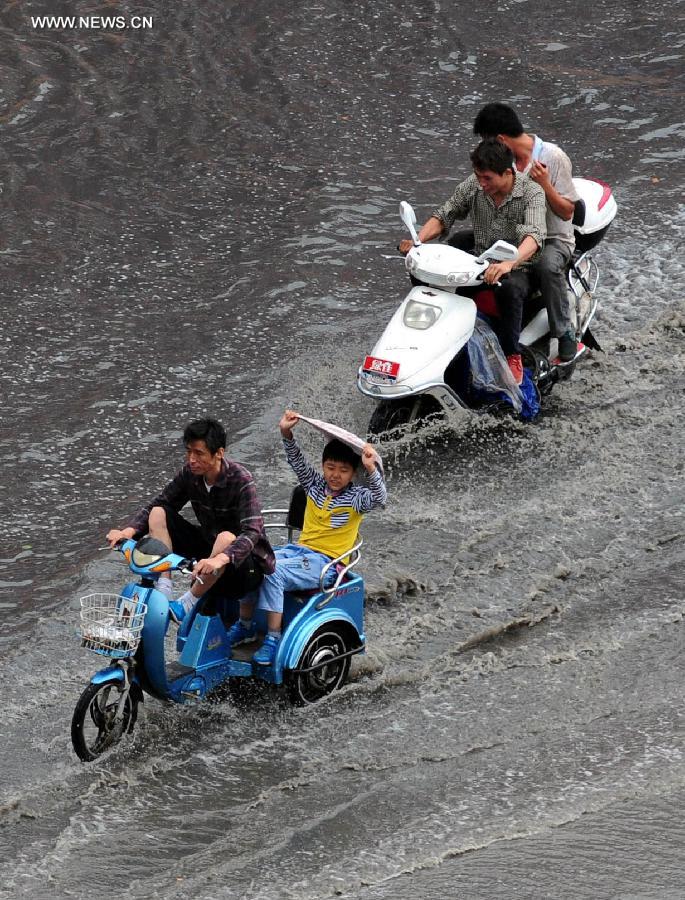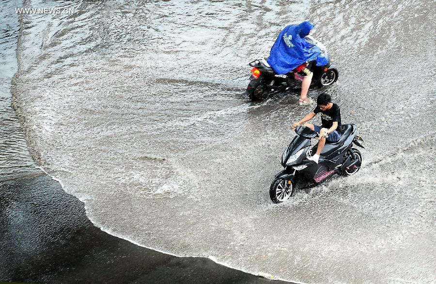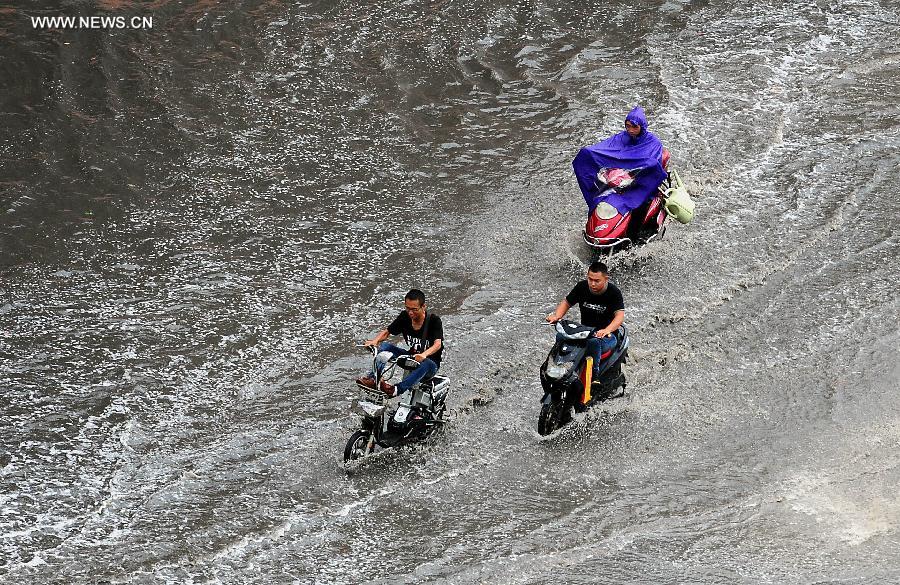 People ride electric vehicles on a flooded road in Zhengzhou, capital of central China's Henan Province, June 19, 2014. The local meteorological authority issued a yellow warning on thunder and heavy rainstorms Thursday. (Xinhua/Wang Song)