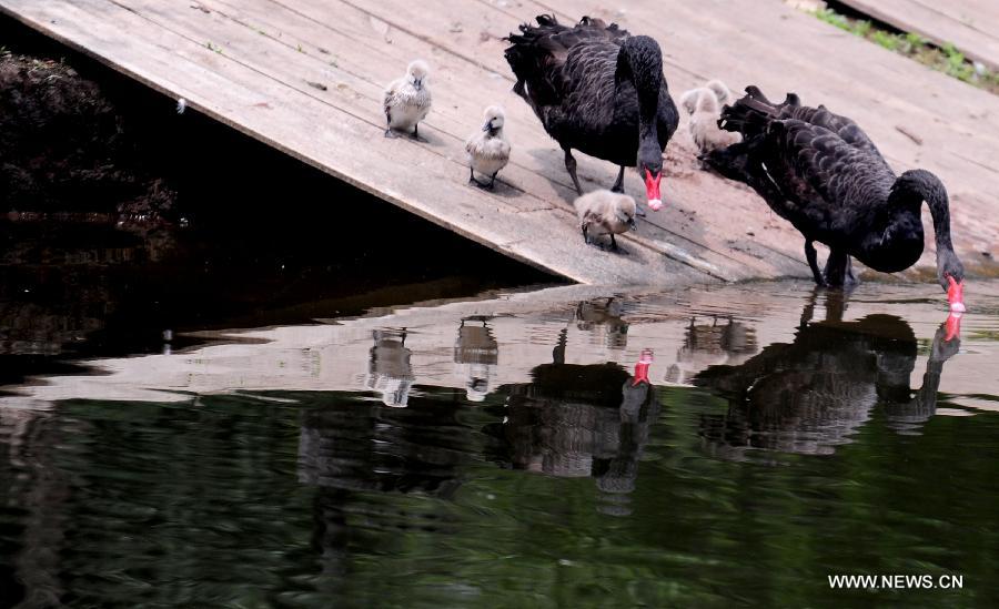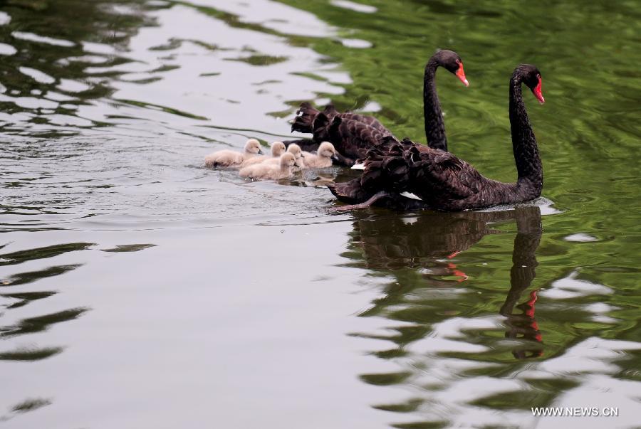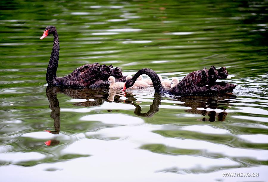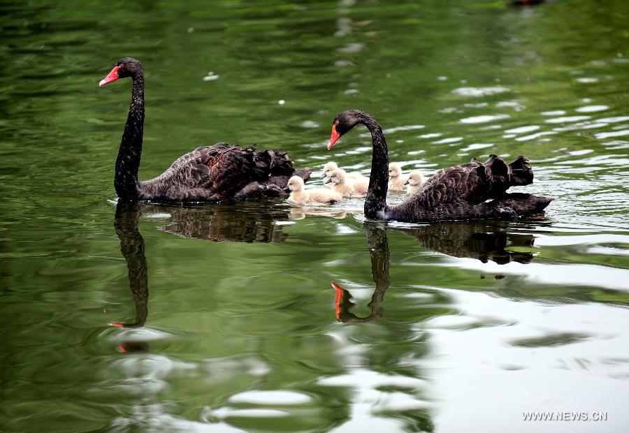 A swan family swims on a lake at Chanbaidao Forestry Park in Shenyang, capital of northeast China's Liaoning province, June 20, 2014. (Xinhua/Zhang Wenkui)