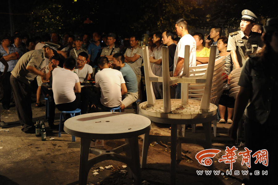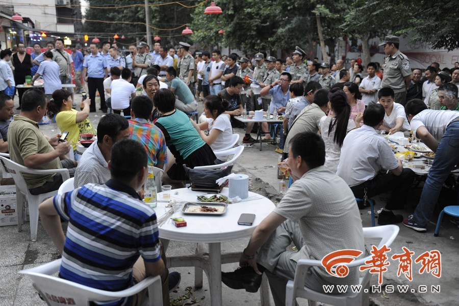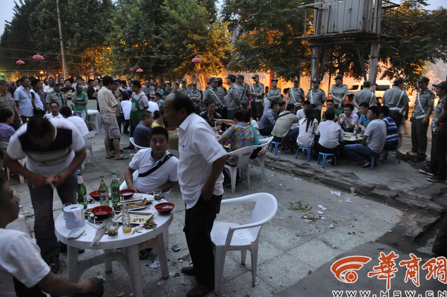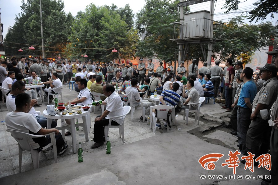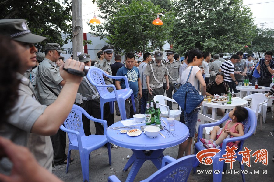 A group of 50 urban management officers or chengguan officers in Xi'an, Shaanxi stare at diners who are reluctant to leave a barbecue stall that occupies a street illegally on June 19, 2014. As an effort to carry out law enforcement in a civilized manner, Chengguan officers of the city’s Lianhu district choose a new tactic to deter stall owners and the consumers by staring at them. It costs the officers 45 minutes to persuade all of the diners at six tables to leave the site. [Photo/hsw.cn]