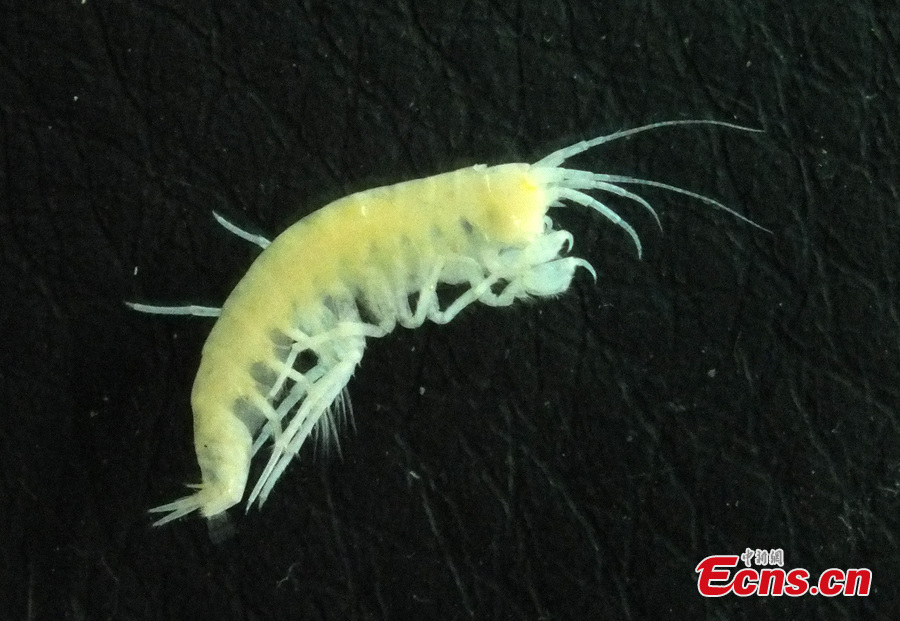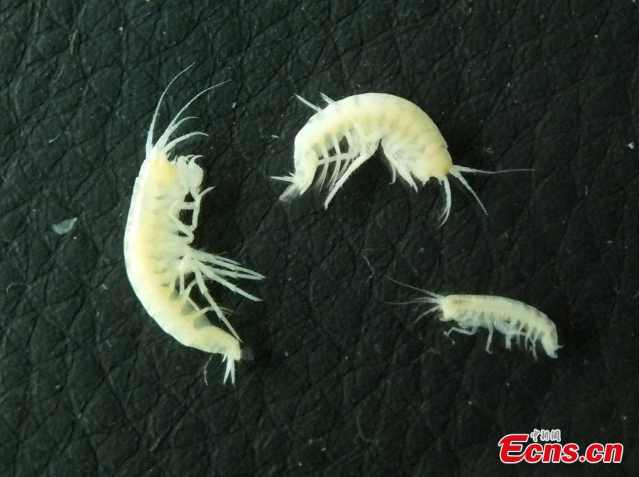 A new species of cave-dwelling shrimp has been found in Longmenshan township of Pengzhou city, southwest China's Sichuan province in June 2014, according to researchers of a local insect museum. The almost-transparent cave shrimp feeds on bat excrement. (Photo: China News Service)
