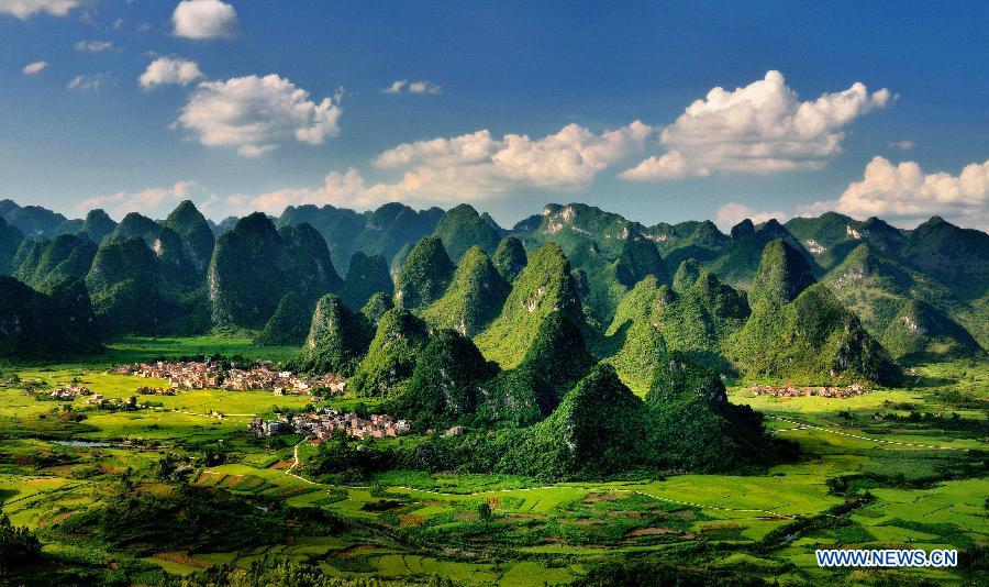 File photo taken on July 24, 2011 shows the scenery of karst landform in Dacai Township under Maonan Autonomous County of Huaijiang, south China's Guangxi Zhuang Autonomous Region. The World Heritage Committee on Monday inscribed an extension of South China Karst, a natural World Heritage Site since 2007, into the UNESCO's World Heritage List. (Xinhua/Wang Xiufa)