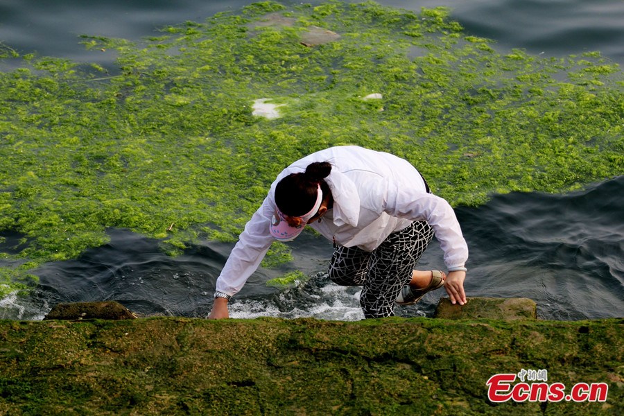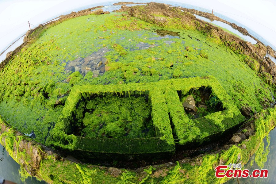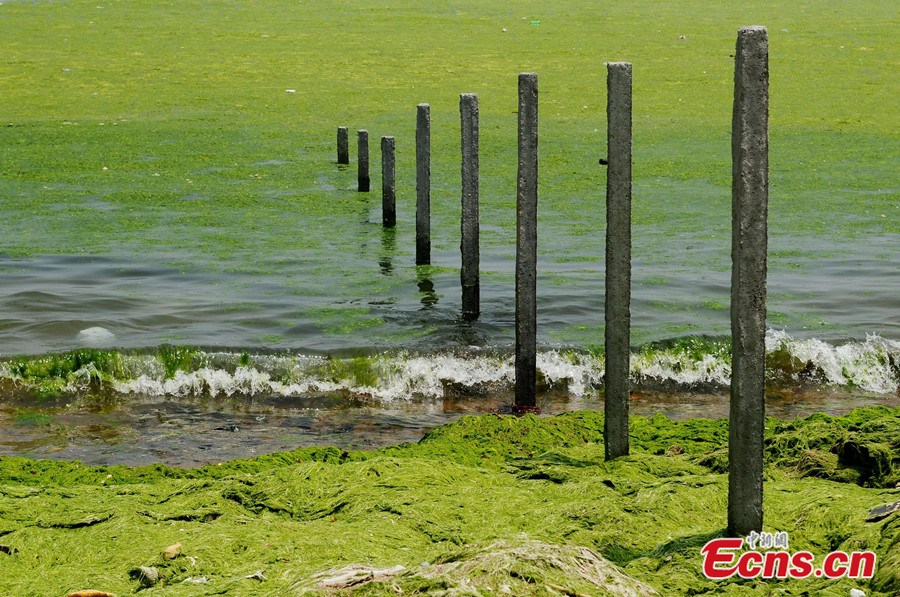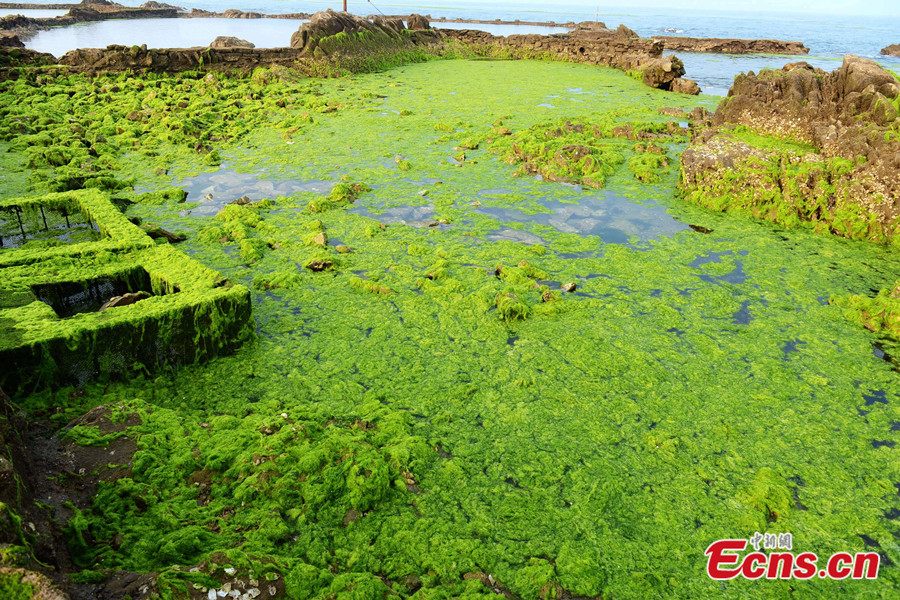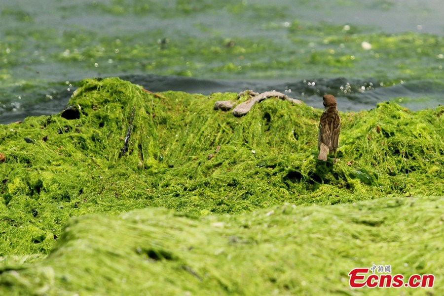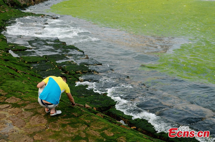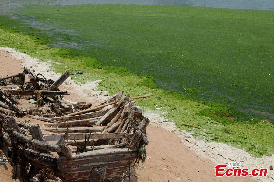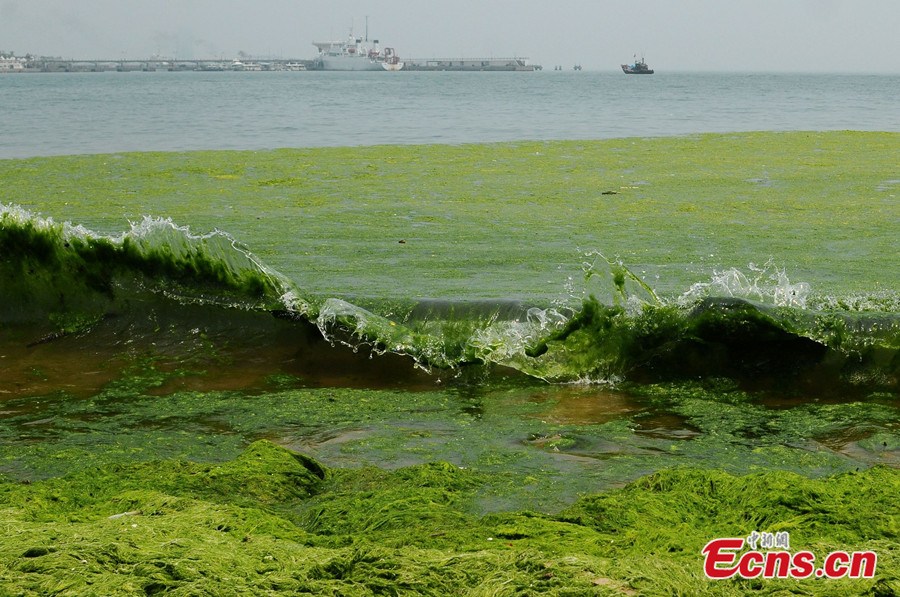 Photo taken on June 23, 2014 shows algae outbreak in coastal waters near Qingdao, east China's Shandong province. It's the 7th consecutive year that green algae invades Qingdao since 2008. [Photo: China News Service / Jin Shaoyue]