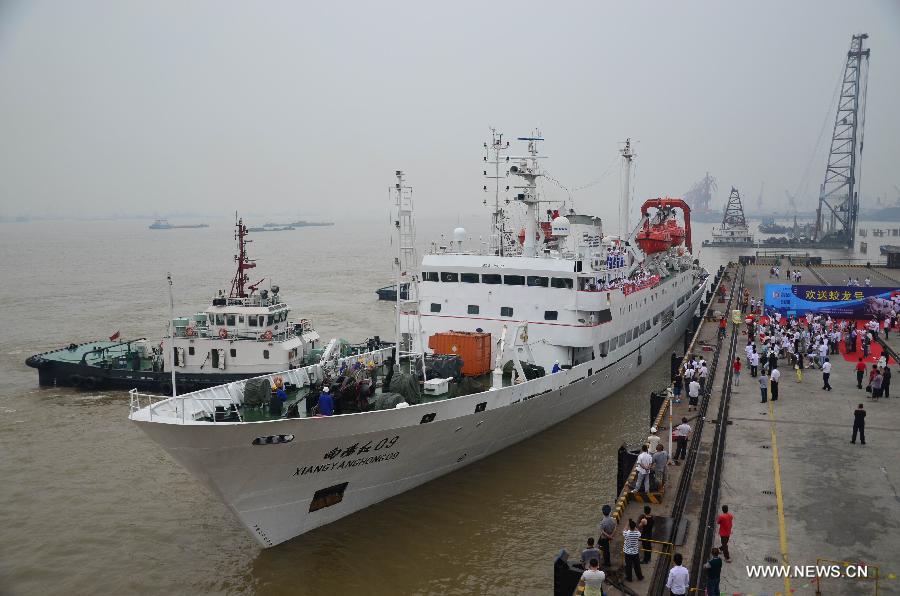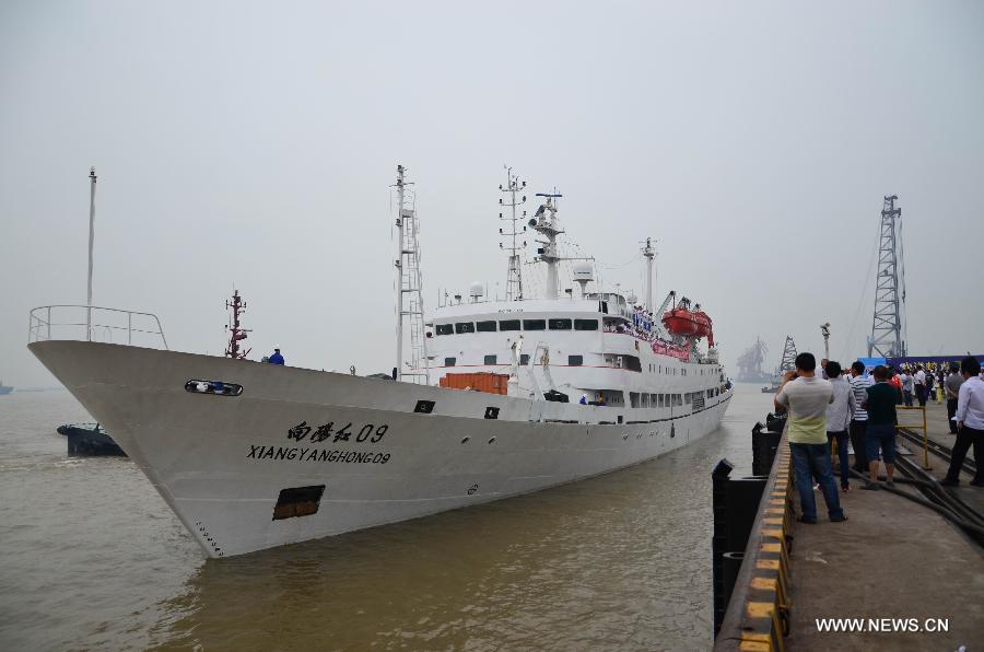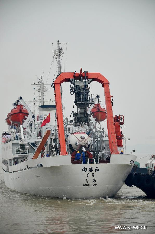 Xiangyanghong 09, carrier of Jiaolong, China's first manned deep-sea submersible, leaves for a voyage in the northwest Pacific Ocean at a port in Jiangyin City, east China's Jiangsu province, June 25, 2014. During the 40-day voyage, Jiaolong will conduct research on cobalt-rich crusts in the ocean and is expected to return in August. (Xinhua/Chen Jian)