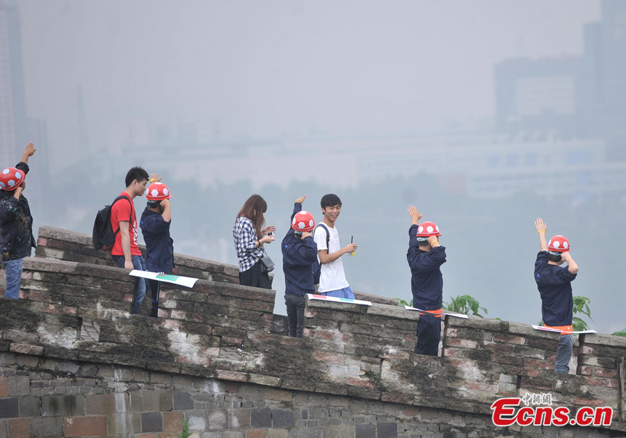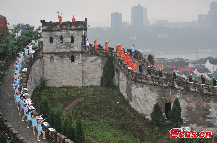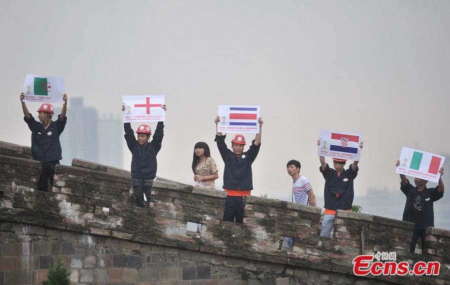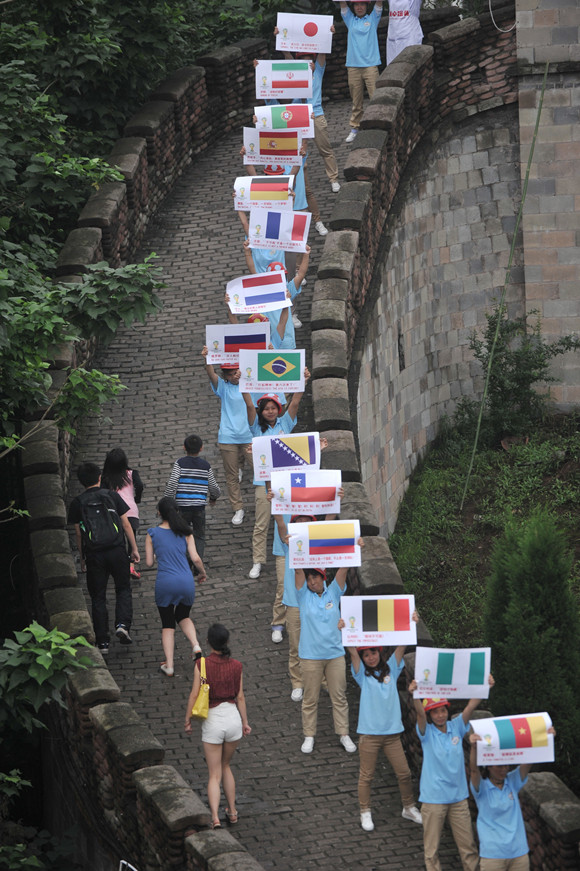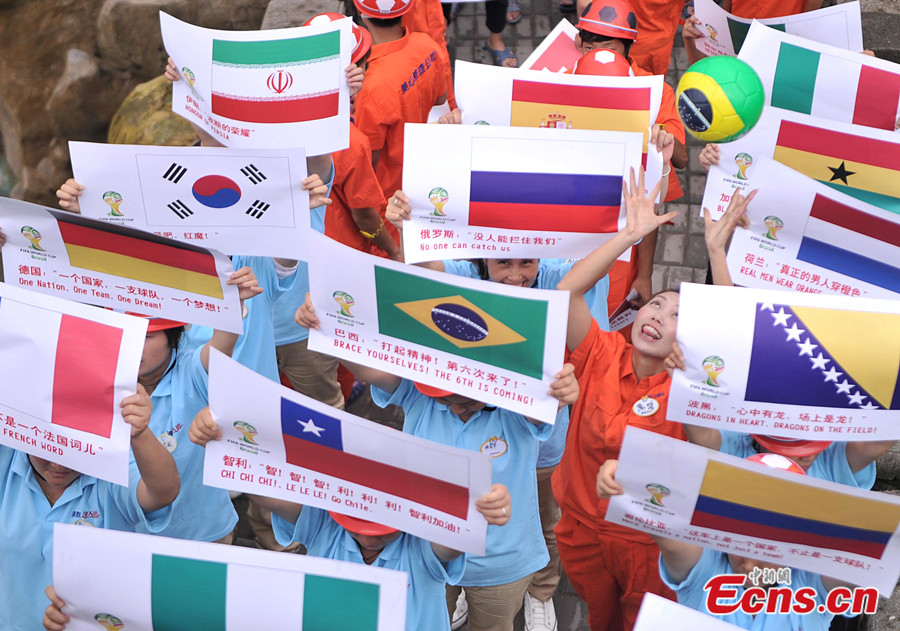 Work staff, from Yangren Jie of southwest China's Chongqing municipality, participates in a flash mob to cheer for ongoing FIFA World Cup on June 25, 2014. [Photo/Chen Chao]
