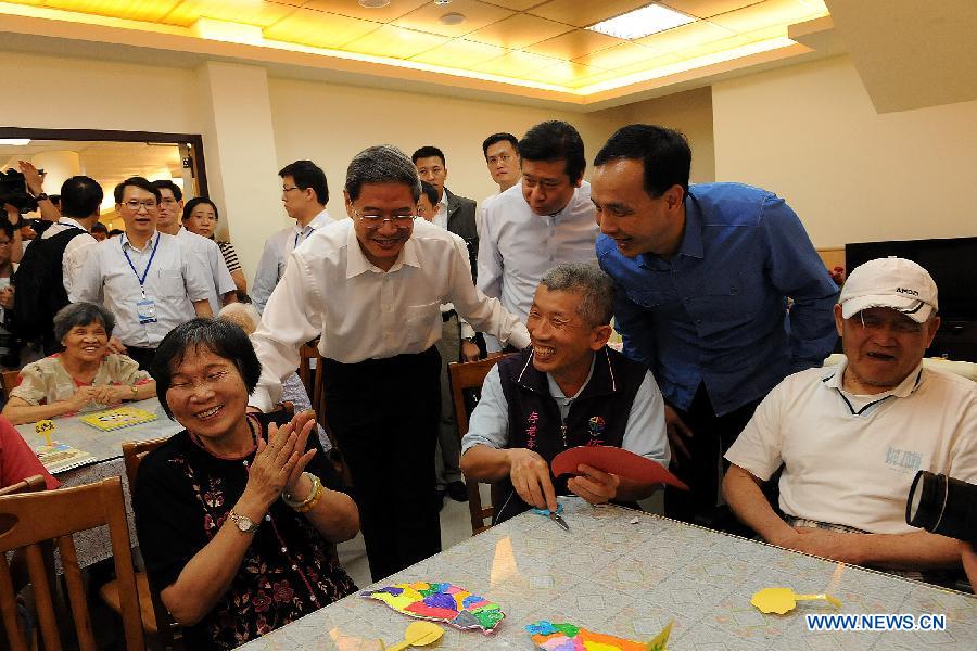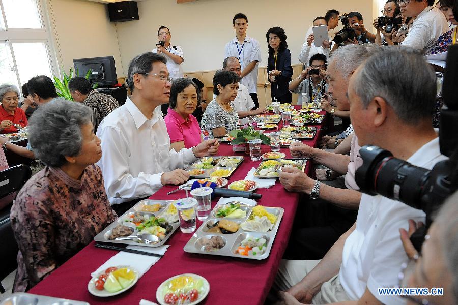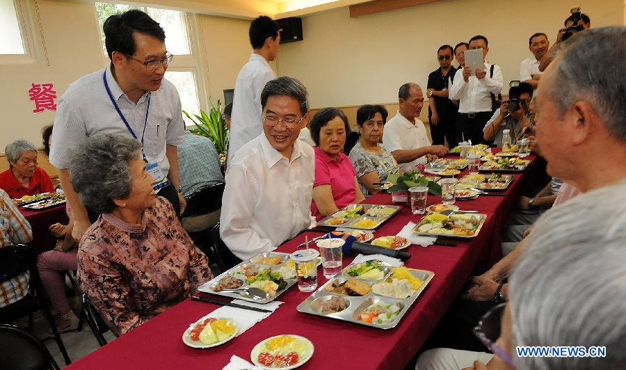 Zhang Zhijun (2nd L), director of the Taiwan Affairs Office of China's State Council, has lunch with senior citizens at a geracomium in Tucheng District of New Taipei City, southeast China's Taiwan, June 26, 2014. Zhang visited the geracomium on Thursday.(Xinhua/He Junchang)
