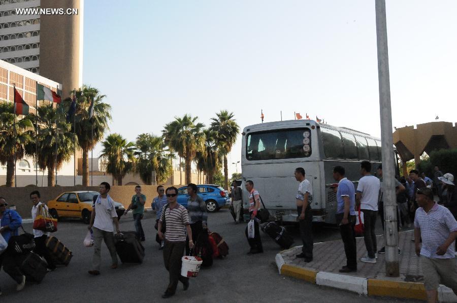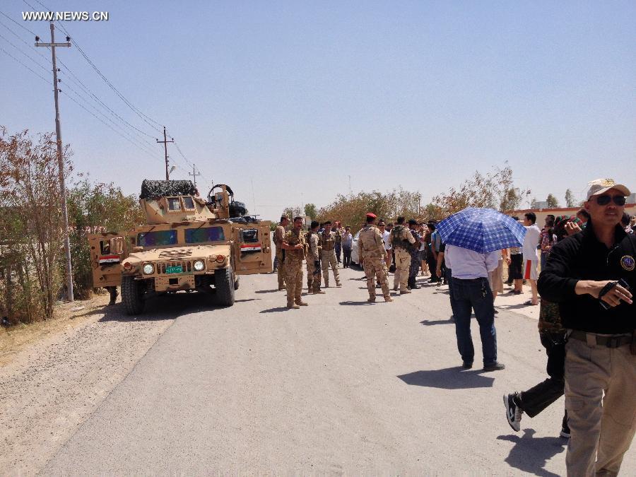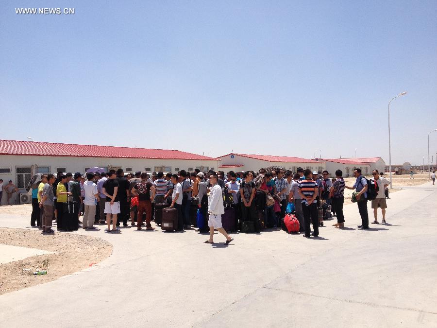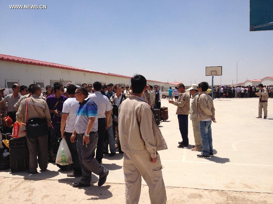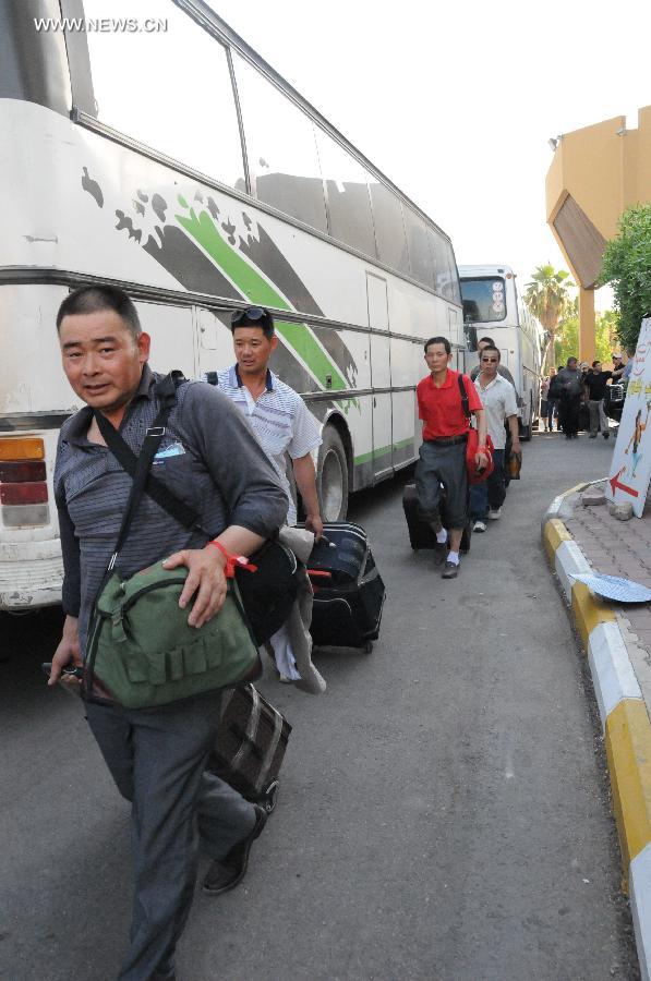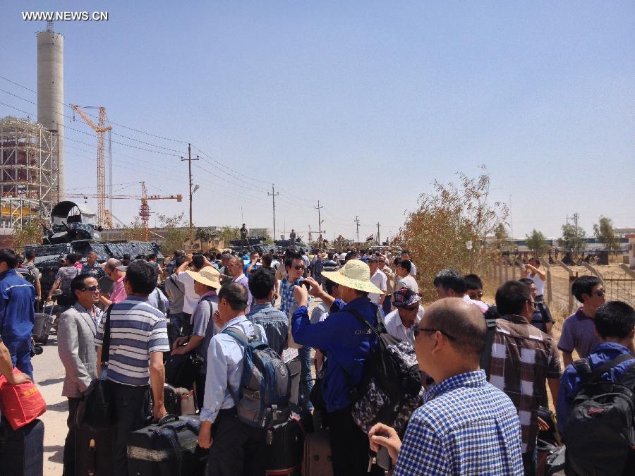 Chinese workers wait for evacuation in Samarra, capital of the Salahudin province, Iraq, on June 26, 2014. All of the more than 1,200 Chinese workers trapped in the northern Iraqi city of Samarra have been safely evacuated to the capital Baghdad, according to the Chinese embassy in Baghdad. (Xinhua/Lu Jianfeng)