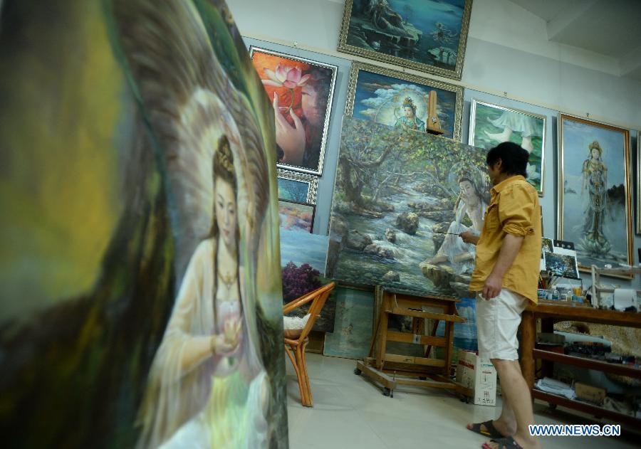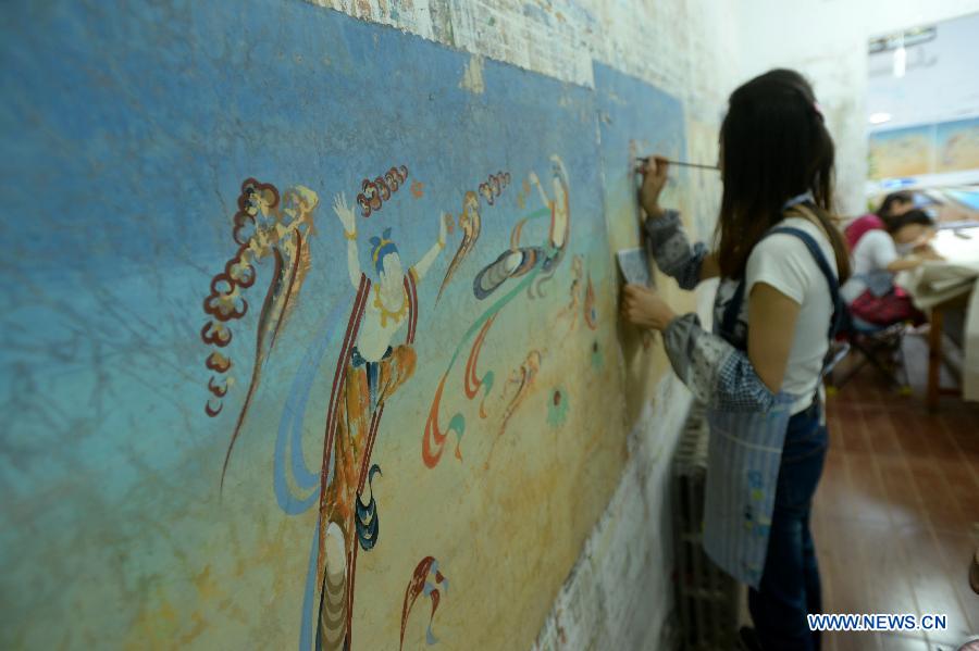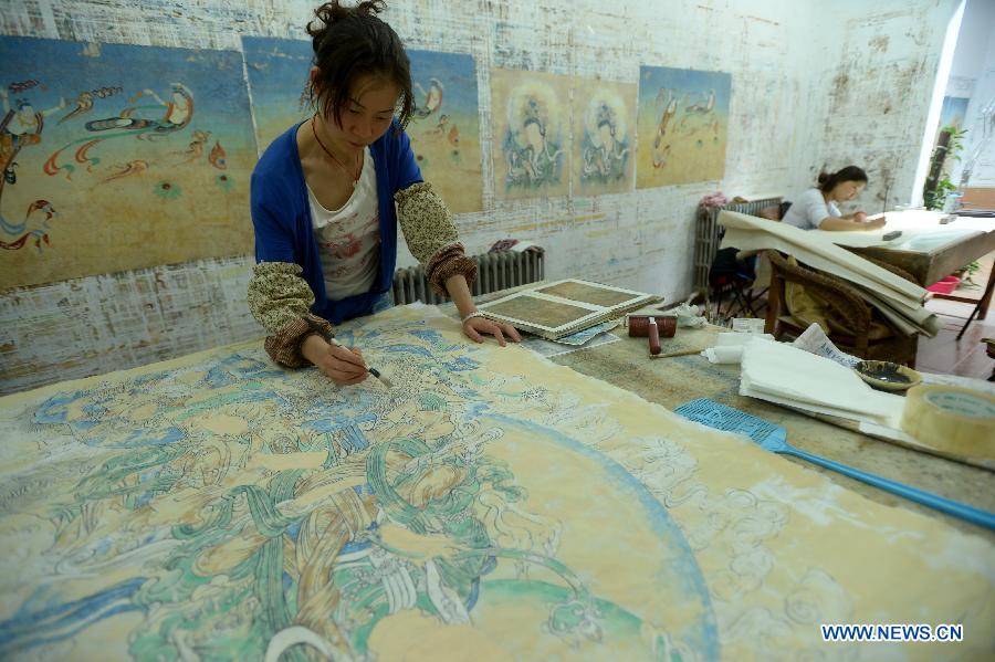 A painter draws a mural painting at a studio in Yuequan Town, Dunhuang City, northwest China's Gansu Province, June 27, 2014. Attracted by the art form of Mogaoku Grottos mural, more and more young artists gathered in Dunhuang to learn for mural creation and set up their studios. (Xinhua/Nie Jianjiang)
