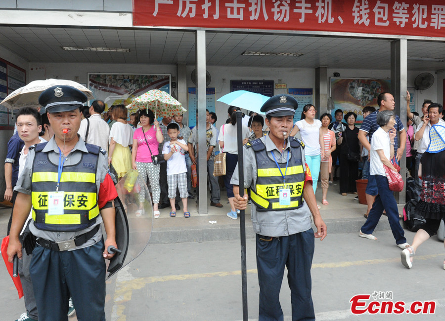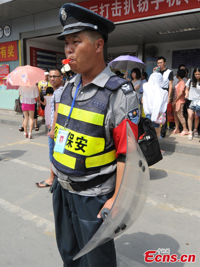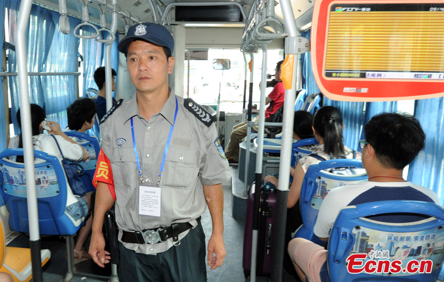 An anti-terrorism security officer is on duty on a bus in Fuzhou, Fujian province on July 1, 2014. The city’s transport department said on July 1 that starting from July, a total of 622 special security officers have been arranged to patrol at 13 bus terminals, 20 bus parking lots and on 213 buses of the city. Equipped with spontoons, police steel forks, and pepper sprays, those officers wear clothes marked with a unified emblem. [Photo/ Liu Kegeng]