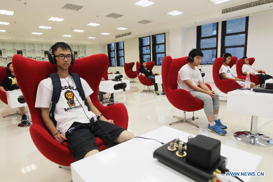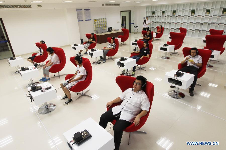 Residents listen to music on rotatable sofa chairs in a music library in Ouhai District of Wenzhou City, east China's Zhejiang province, July 1, 2014. The music library here, covering more than 200 square meters, collected 592 original music CDs. A total of 15 rotatable sofa chairs are installed in the library for people to enjoy music. (Xinhua/Su Qiaojiang)