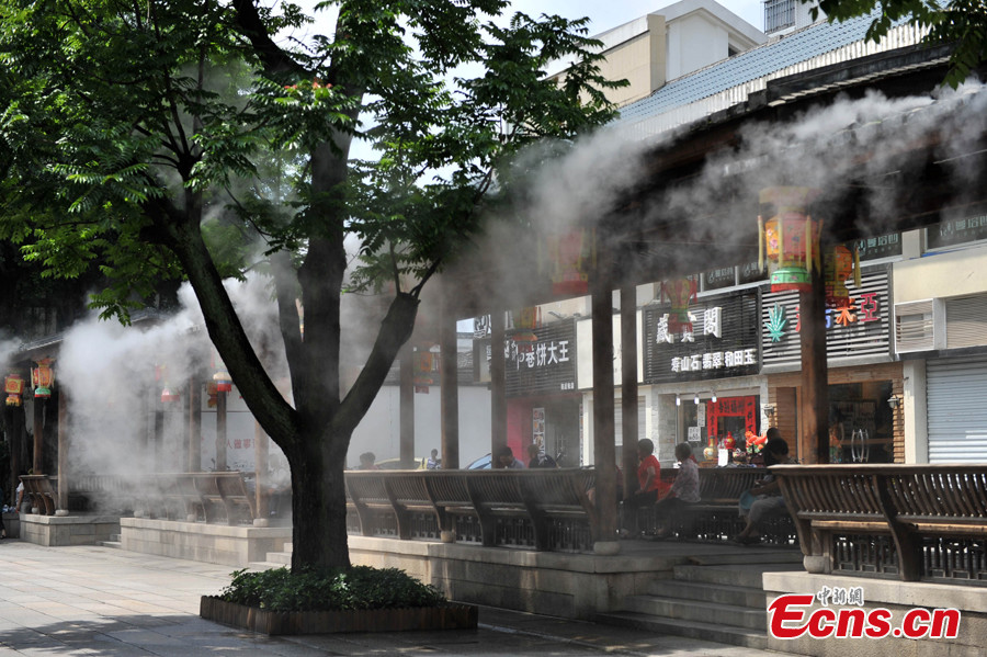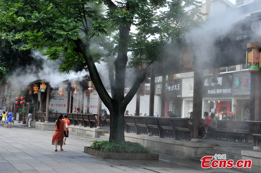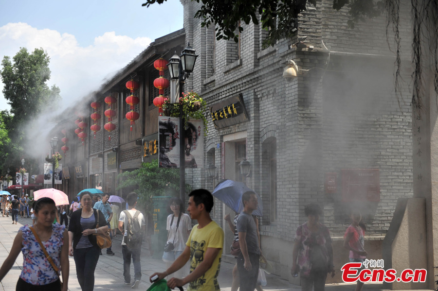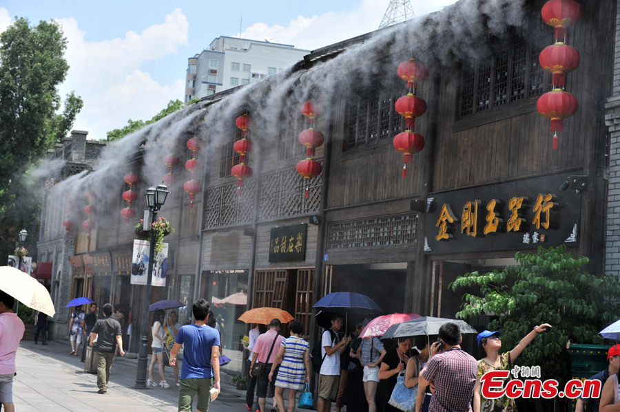 Tourists enjoy their time at the Three Alleys and Seven Lanes, a historic site in Fuzhou, east China's Fujian Province, Wednesday, July 2, 2014. As temperatures continue to rise, authorities there have introduced "spray cooling" systems to provide some relief for tourists. (Photo: China News Service/Lv Ming)