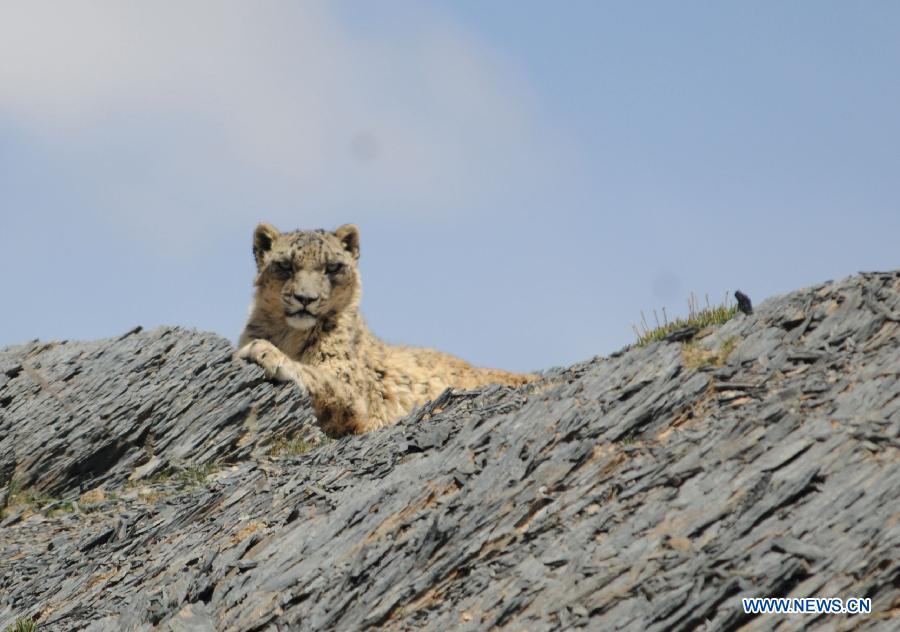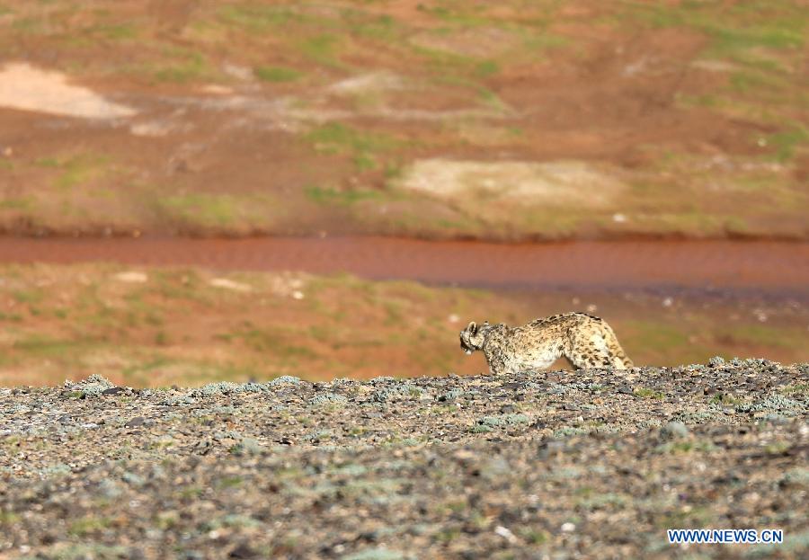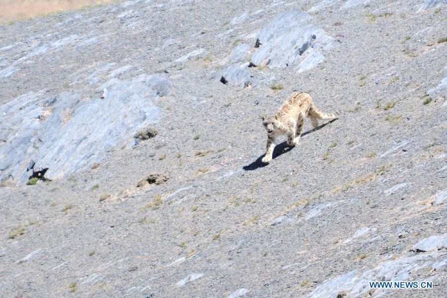 A wild snow leopard runs in Chang Tang Nature Reserve, southwest China's Tibet Autonomous Region, June 30, 2014. A wild animal research team organized by local forestry bureau was lucky to catch snapshots of a wild snow leopard at the nature reserve. (Xinhua/Zongga)