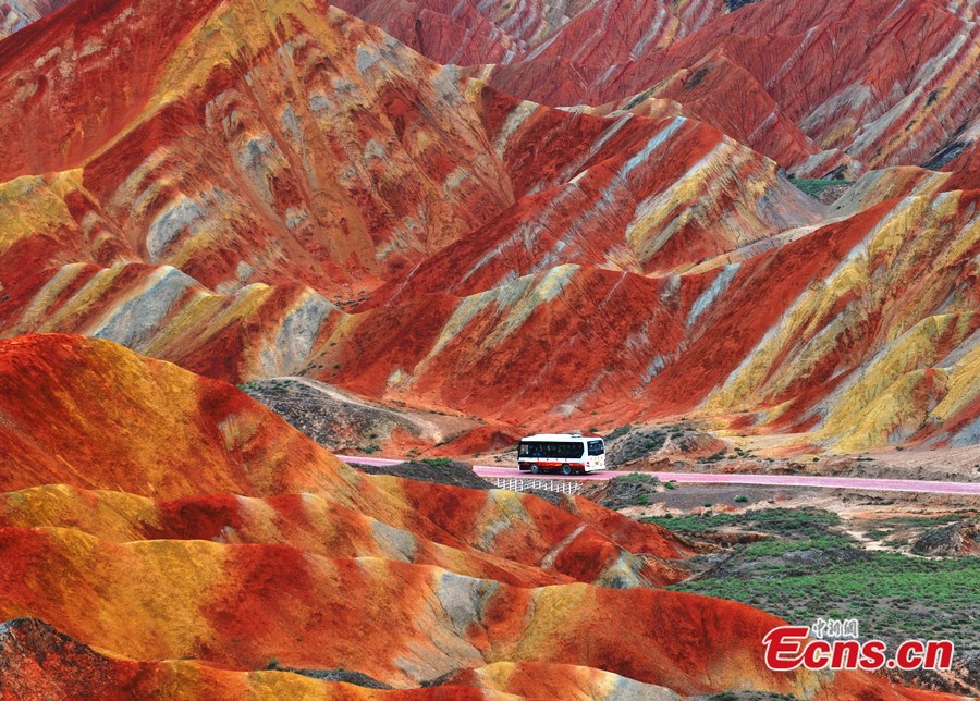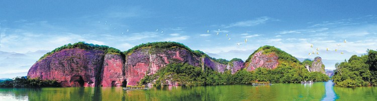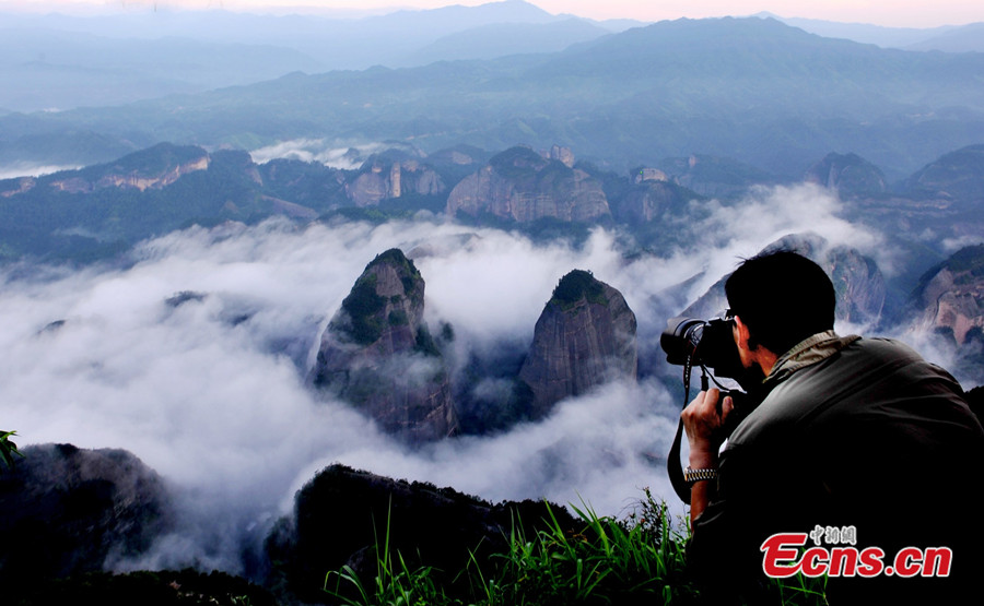 Mount Danxia is a noted scenic area near Shaoguan in the northern part of Guangdong province. The Danxia mountain is formed from a reddish sandstone that has eroded over time forming a range of mountains surrounded by curvaceous cliffs and unusual rock formations (Danxia Landform). It is described by the local signage as a "world famous UNESCO geopark of China." There are a number of temples located on the mountain range and visitor can enjoy many scenic walks in the area. There is also a river that winds through the mountain area and boat trips along the river are offered to visitors. [Photo/China News Service]