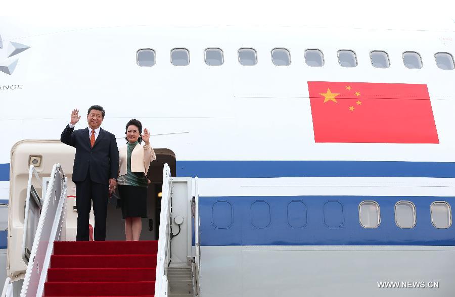 Chinese President Xi Jinping (L, front) and his wife Peng Liyuan (R, front) inspect an honor guard upon their arrival in Seoul, capital of South Korea, July 3, 2014. Chinese President Xi Jinping arrived in Seoul Thursday for a two-day state visit to South Korea. (Xinhua/Lan Hongguang)