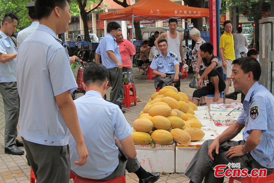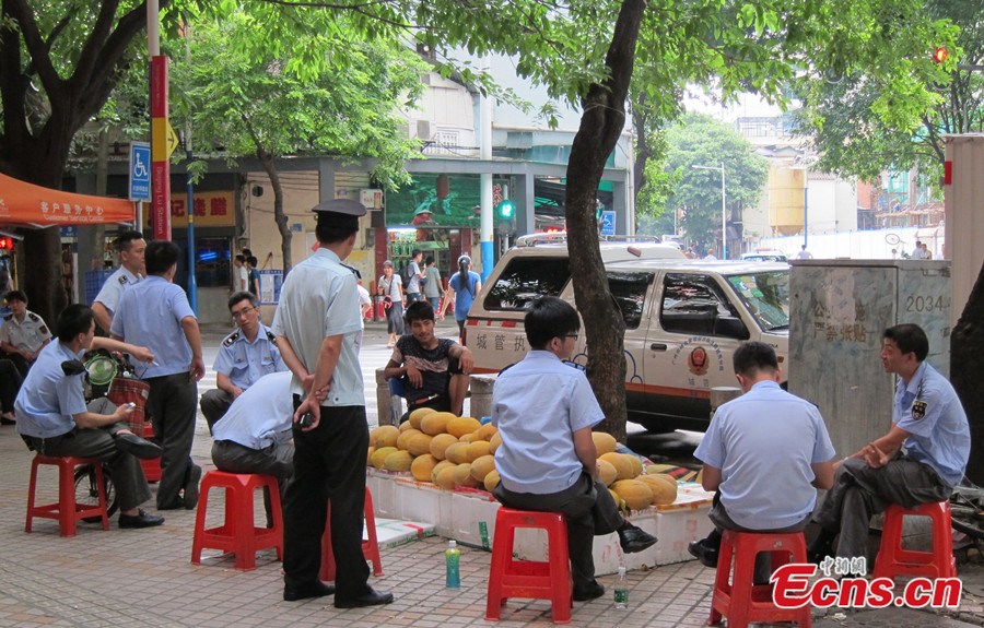 A team of urban management officers or Chengguan officers in Guangzhou, Guangdong province talk with owner of a fruit stand, so as to persuade him to leave the streets he occupies with his business stall on July 3, 2014. As an effort to carry out law enforcement in a civilized manner, Chengguan officers of the city’s Yuexiu district choose to deter stall owners by carrying out heart-to-heart talk with them. [Photo: China News Service/ Liang Yongqiang]