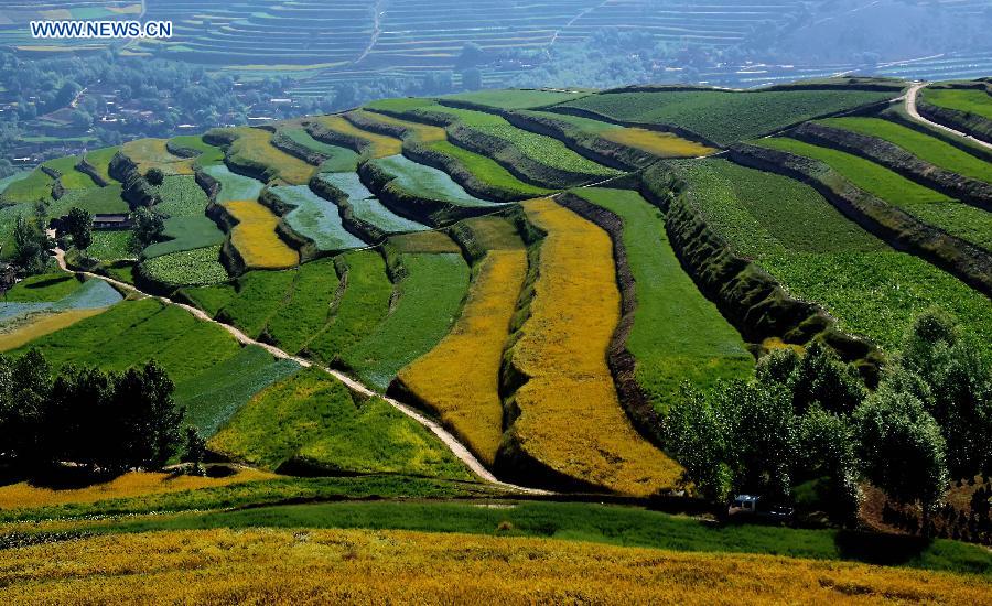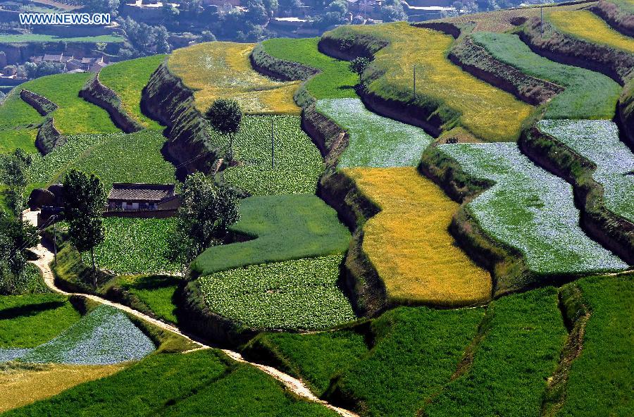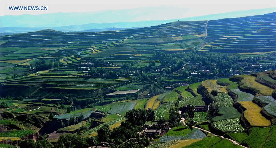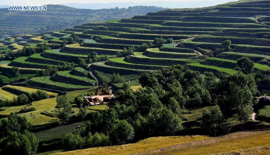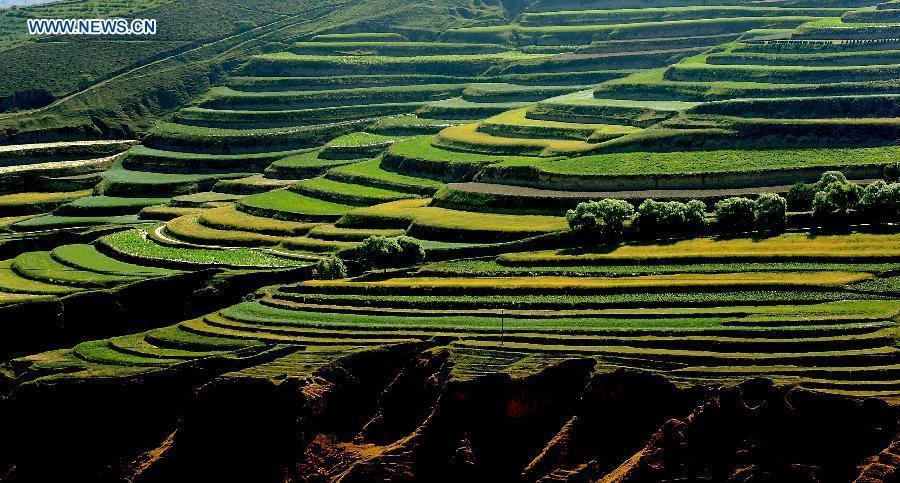 Photo taken on July 4, 2014 shows the scenery of terrace fields in Dingxi, northwest China's Gansu Province. (Xinhua/Wang Song)