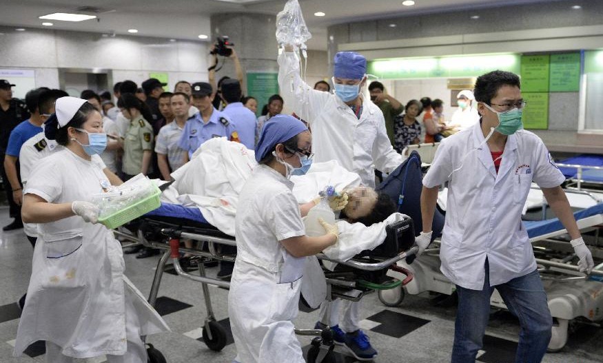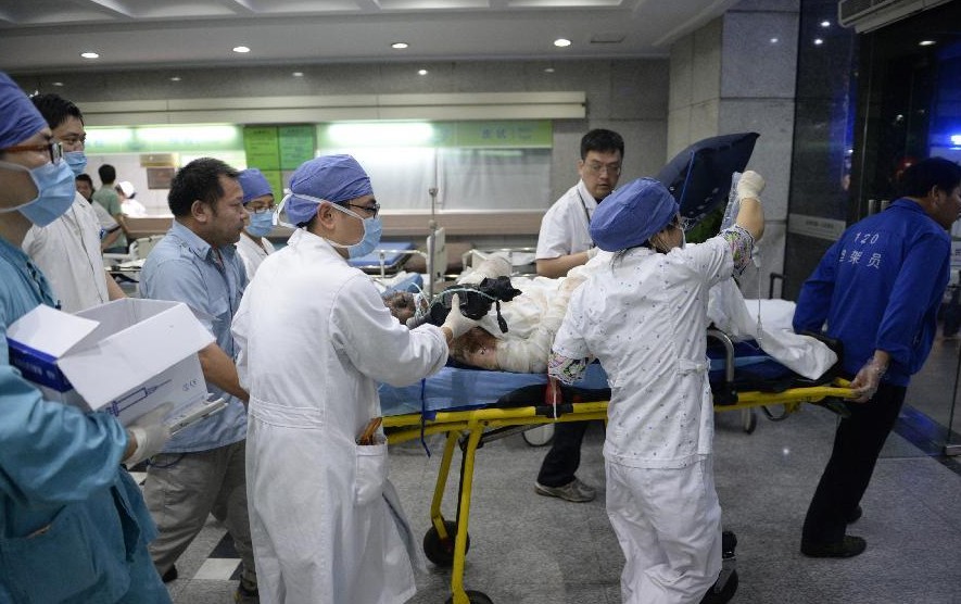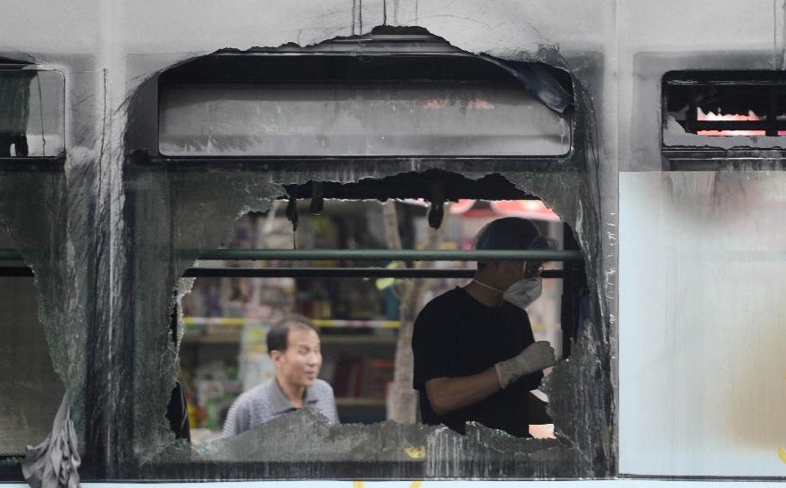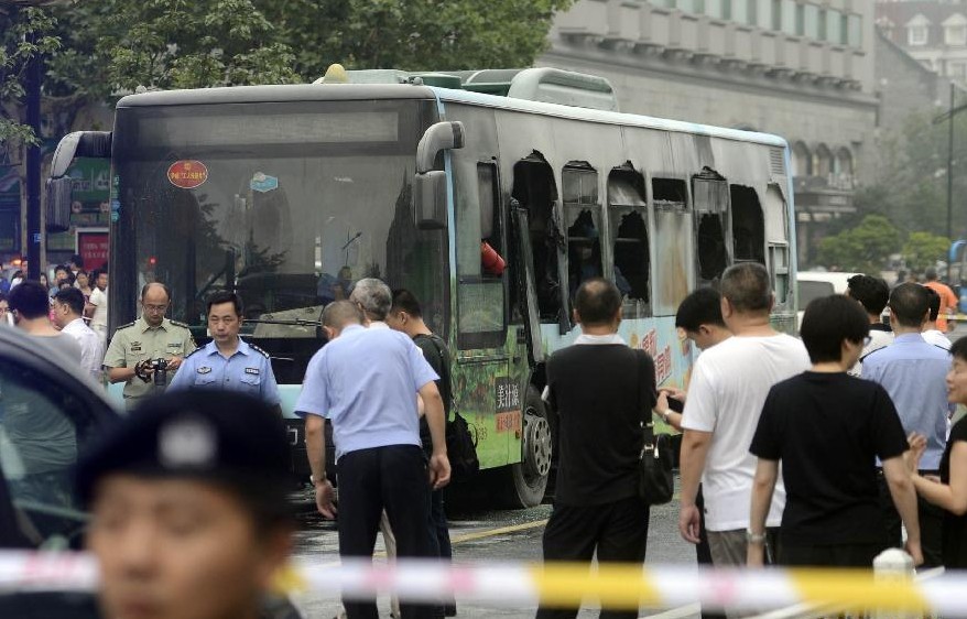 Police cordon off the site where a bus was in flames in Hangzhou, capital of east China's Zhejiang Province, July 5, 2014. Thirty-two injured people were sent to hospitals after a bus caught fire on Saturday afternoon in downtown Hangzhou. No death case has been reported. The cause of the blaze is being investigated. (Xinhua/Han Chuanhao)
