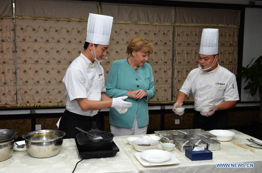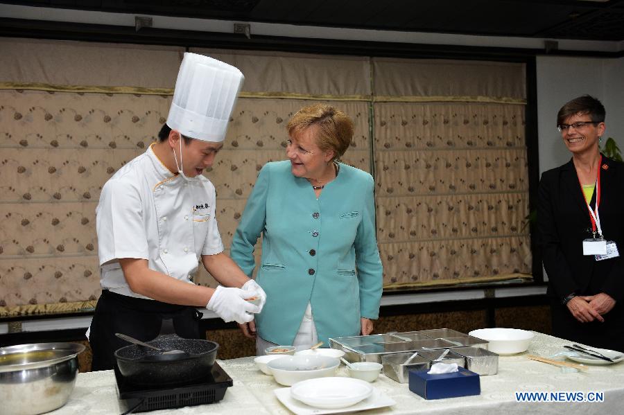 German Chancellor Angela Merkel (R) learns to cook Kung Pao Chicken, a traditional Chinese dish, in Chengdu, capital of southwest China's Sichuan Province, July 6, 2014. Merkel is on her seventh China visit as chancellor from July 6 to 8.(Xinhua)