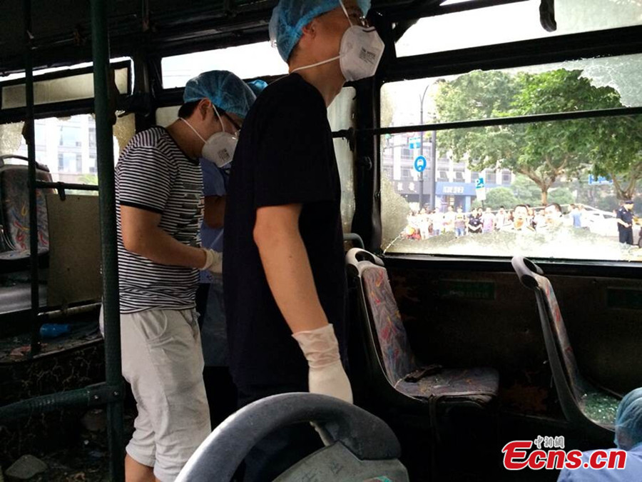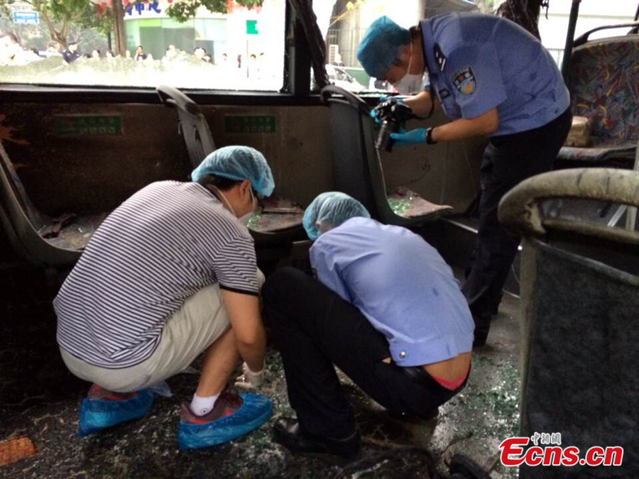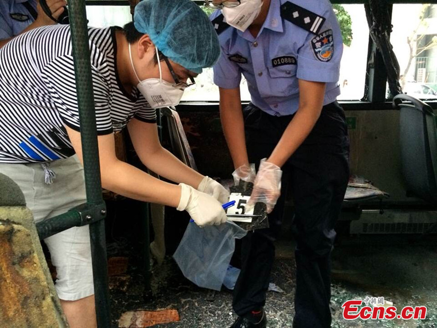 Police officers collect evidences on the bus burned in arson in Hangzhou, capital of east China's Zhejiang province on July 6, 2014. The fire broke out at around 5 pm of July 5, when the No.7 line bus carrying 80 people was on the Qingchun Road in the downtown of the city. The accident injured 32 people, including 15 critically. Local police said the fire is caused by arson, and an investigation is underway. [Photo: China News Service/ Chen Fu]