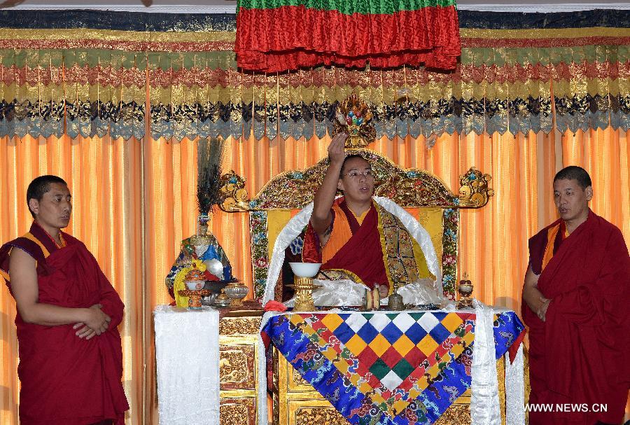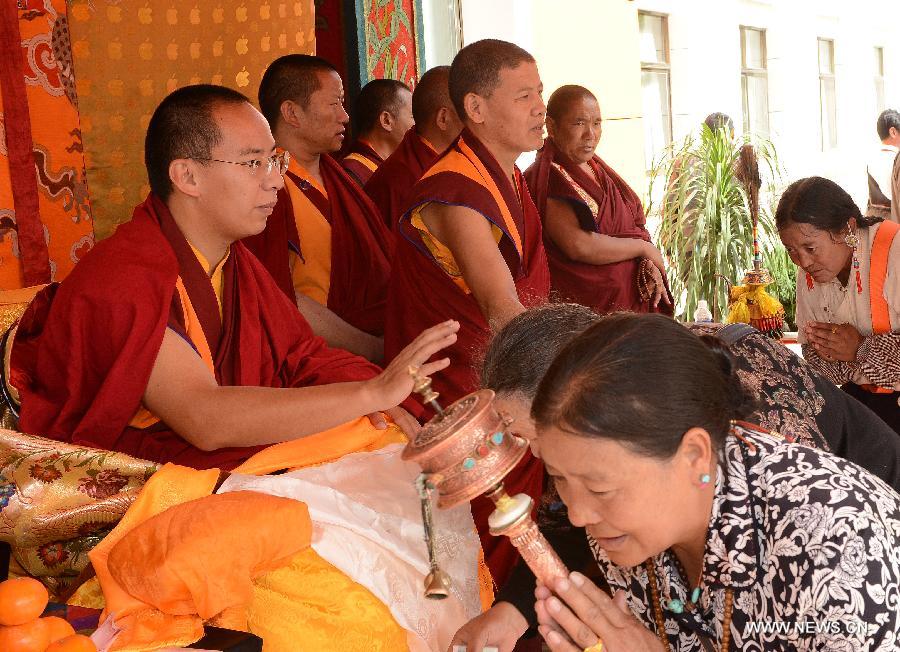 The 11th Panchen Lama Bainqen Erdini Qoigyijabu (1st R), who is also the vice president of the Buddhist Association of China (BAC) and a member of the Standing Committee of the Chinese People's Political Consultative Conference (CPPCC) National Committee, is greeted by monks from the Tibet branch of the BAC in Lhasa, capital of southwest China's Tibet Autonomous Region, July 5, 2014. The Panchen Lama visited people from religious groups in Lhasa for the past few days, talking with them and offering head-touching blessings to Buddhist believers. (Xinhua/Chogo)