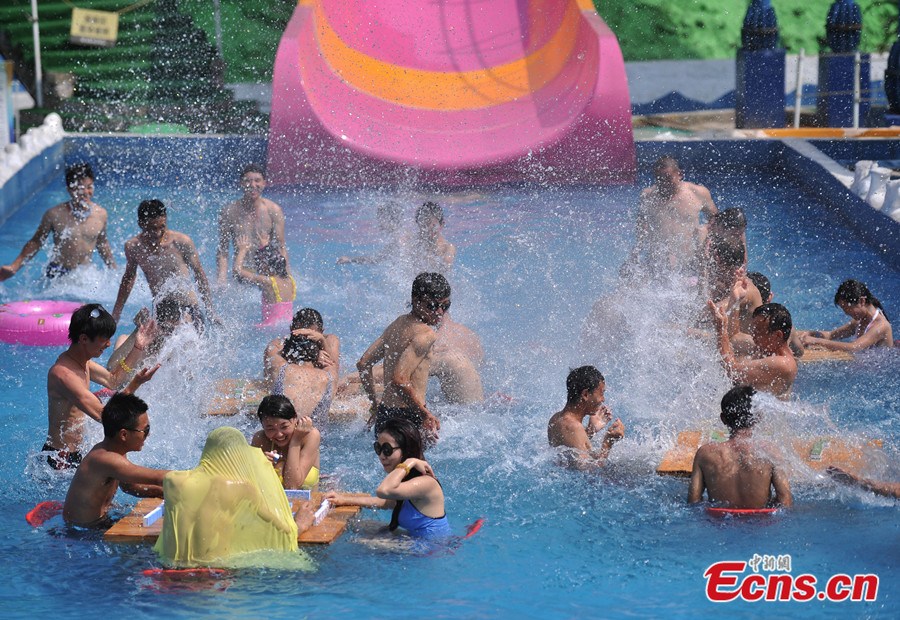 Mahjong players in Chongqing municipality find a perfect way to keep cool by moving their games to a swimming pool on July 8, 2014. Meteorological station of the city issued an orange heat alert on the same day. [Photo: China News Service/ Chen Chao]
