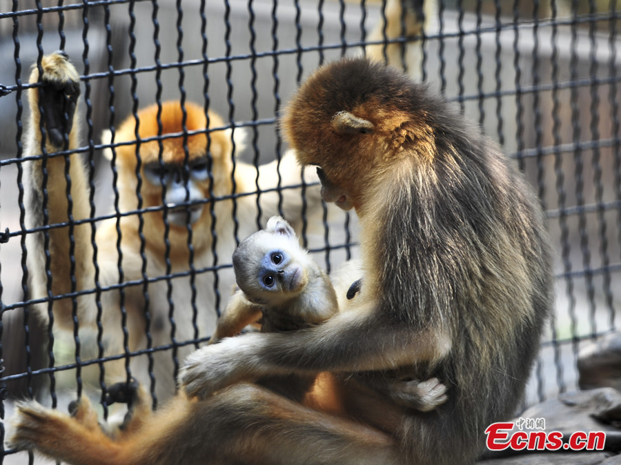 A newly-born golden monkey cub rests in its mother's arms at Jinan Zoo in Jinan city of east China's Shandong province on July 8, 2014. Golden monkey is China's first-class national protected animal. [Photo: China News Service / Zhang Yong]