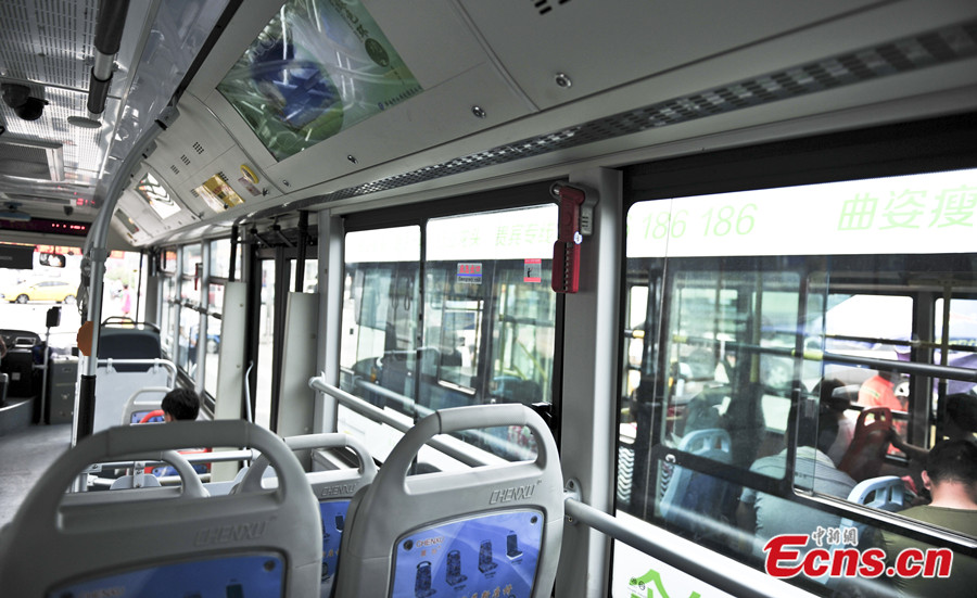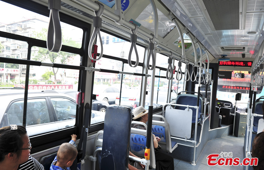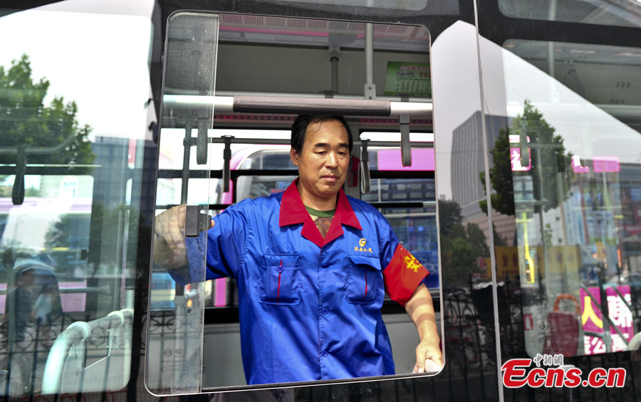 A worker checks a movable window that is newly installed on an air-conditioned bus in Jinan, Shandong province on July 8, 2014. In a safety overhaul carried out on the city’s 4700 buses, air-conditioned buses with fixed windows have now been fitted with movable ones. [Photo: China News Service/ Zhang Yong]