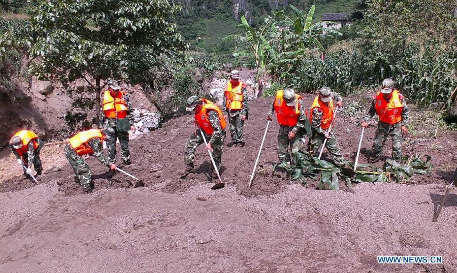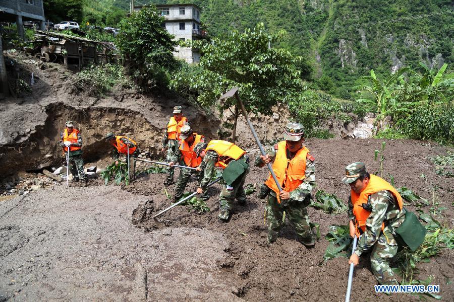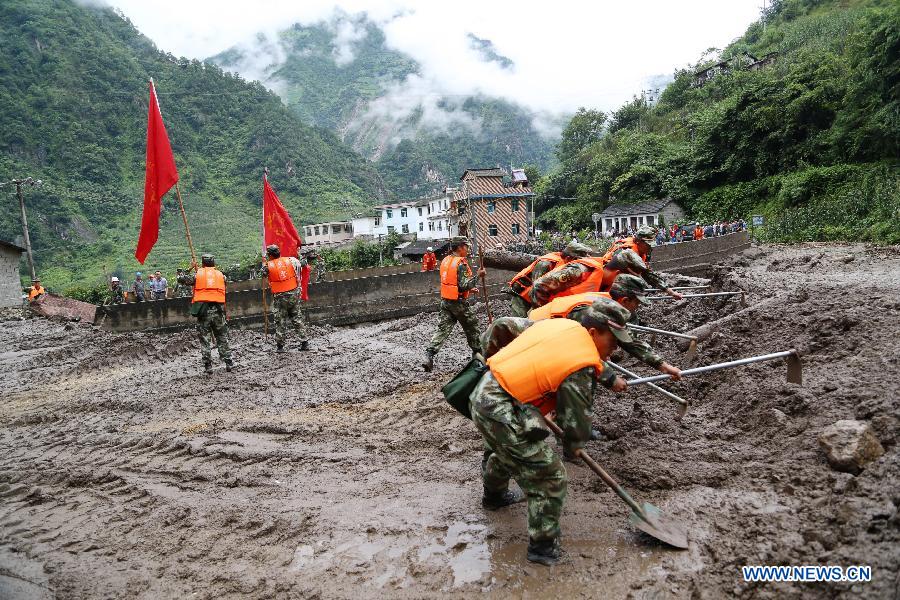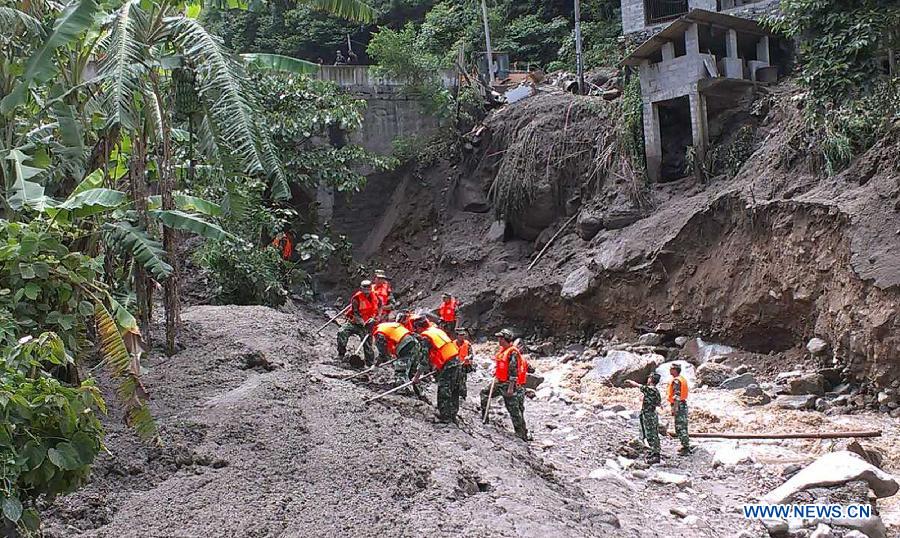 Rescuers clear the debris after a mudslide hit Shawa Village in Fugong County, southwest China's Yunnan province, July 9, 2014. Seventeen people were missing in the mudslide which occurred early Wednesday morning. (Xinhua/Chen Wenming)