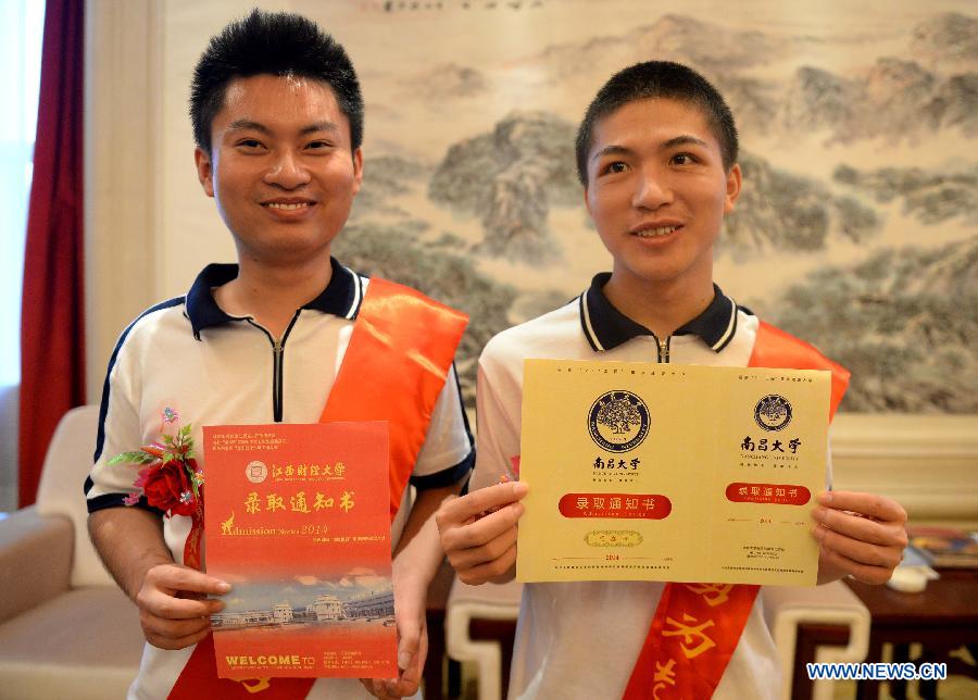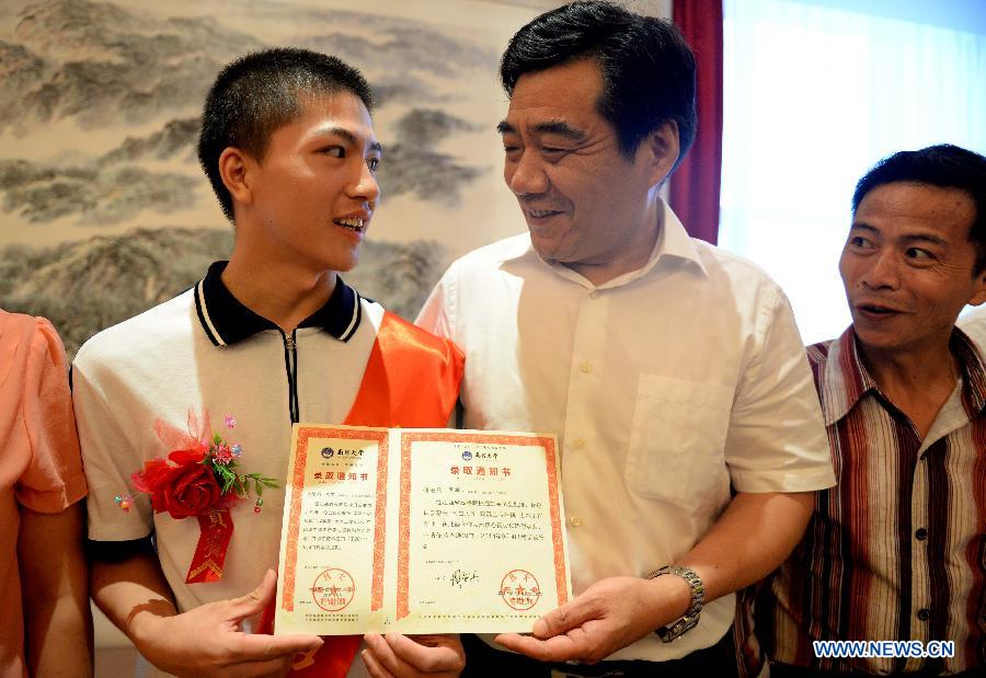 Liao Jinqiu (L), secretary of the party committee of Jiangxi University of Finance and Economics, gives the admission letter to Yi Zhengyong in Yichun, east China's Jiangxi province, July 9. 2014. Liu Yanbing and Yi Zhengyong, both from No.3 Middle School in Yichun, were seriously injured during a fight against an assailant who was stabbing passengers on a bus on May 31. They were unable to take the national college entrance exam on June 7 and 8 as they were still recovering from their injuries. After they recovered, they took a separate exam and were then enrolled by Nanchang University and Jiangxi University of Finance and Economics respectively. (Xinhua/Chen Zixia)