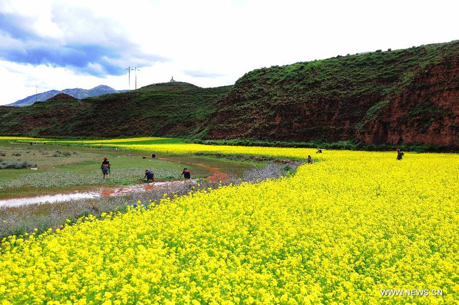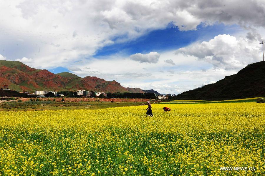 Local residents work in the fields of rape flowers in Bolo Village under Konjo County of Chamdo Prefecture, southwest China's Tibet Autonomous Region, July 9, 2014. (Xinhua/Wen Tao)