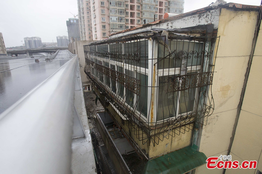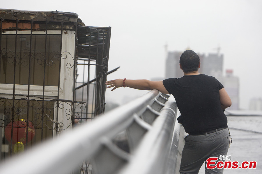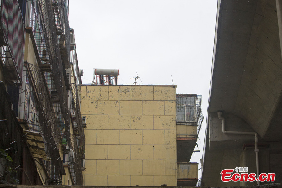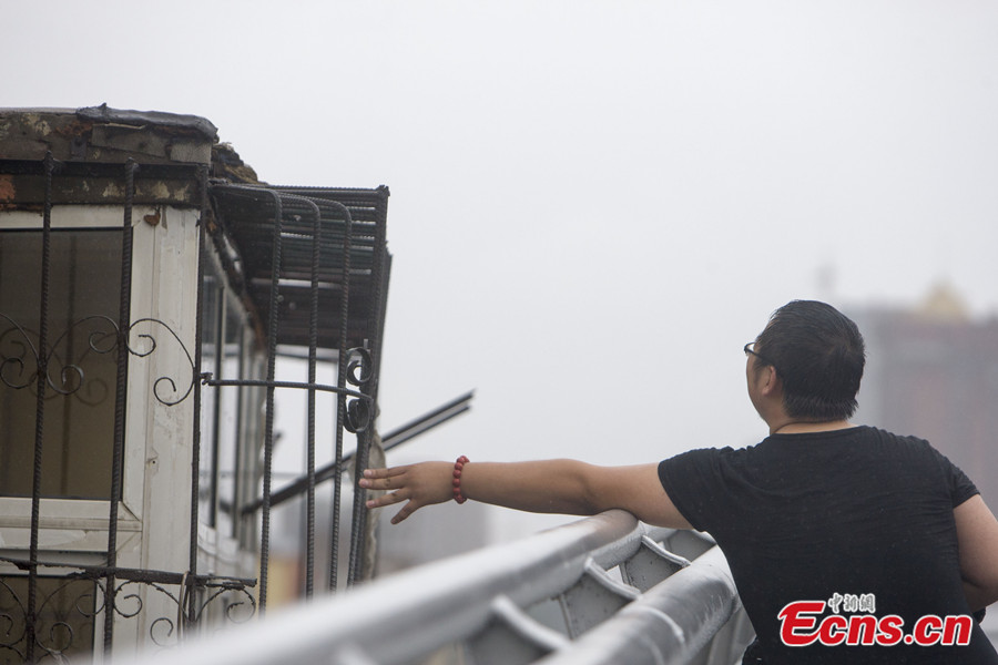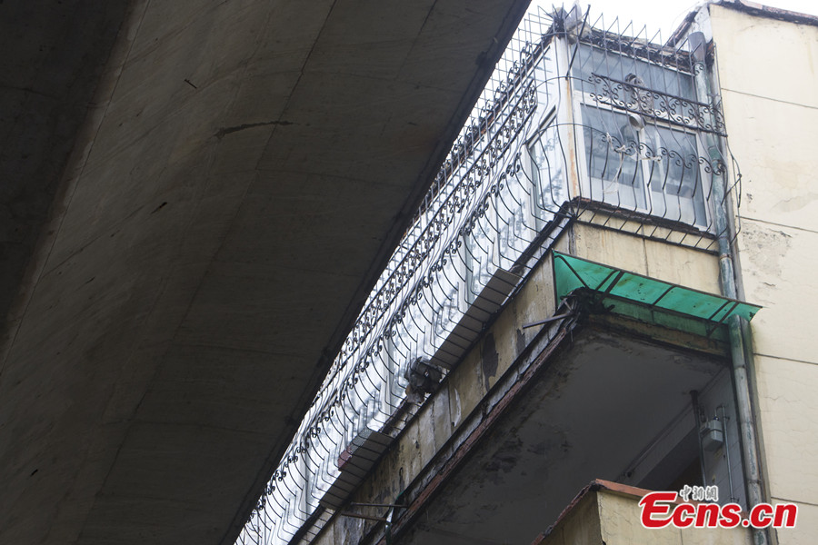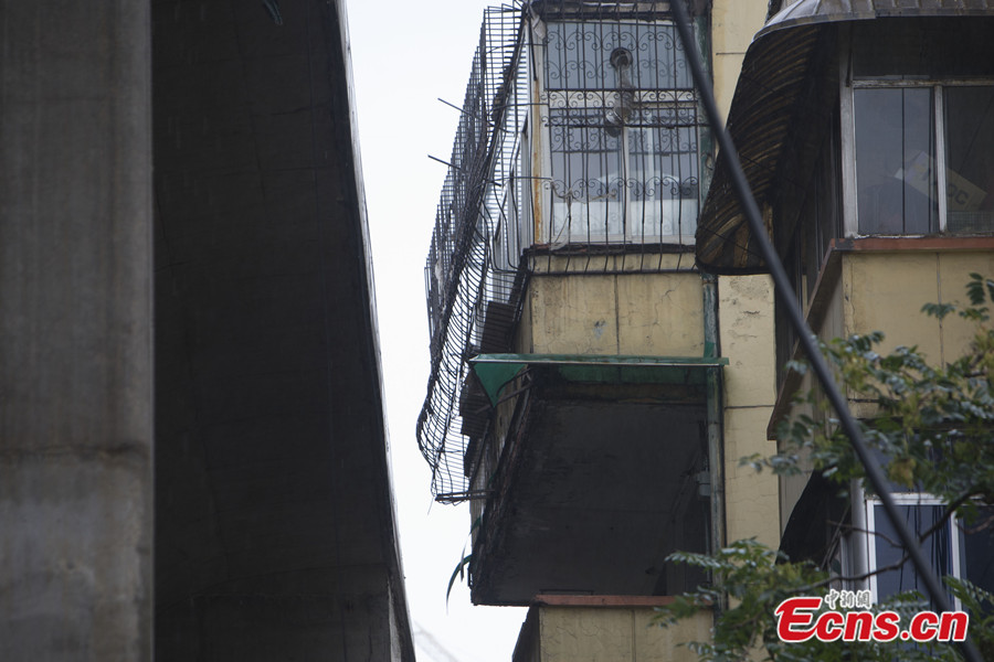 A man standing on a viaduct in Taiyuan, Shanxi province stretches his arm and touches security bars outside the window of a residential apartment on July 9, 2014. The distance between the newly established viaduct and residential buildings of a nearby community is even shorter than the length of the arm of people. [Photo: China News Service/ Zhang Yun]