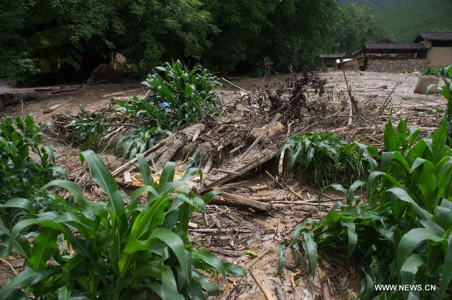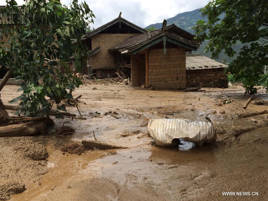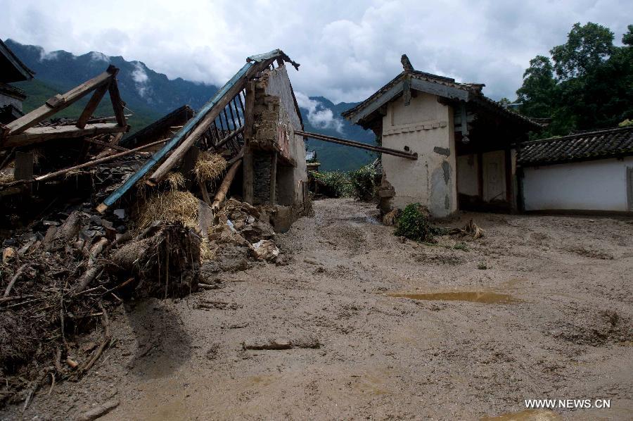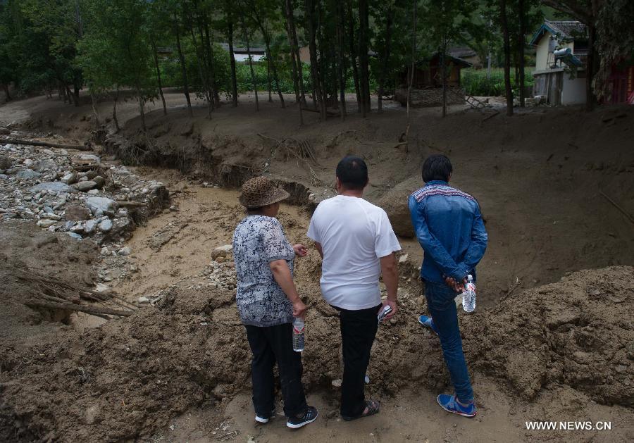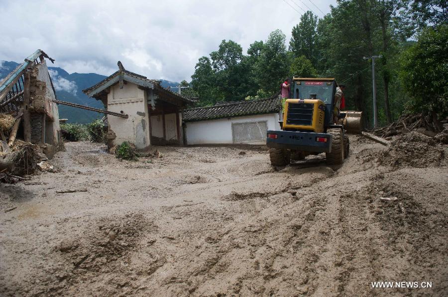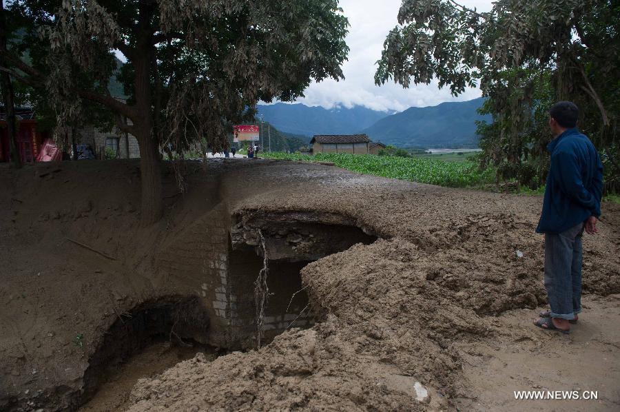 A villager checks the site after a rain-triggered landslide hit Gelan Village of Shangri-La County in Diqing Prefecture, southwest China's Yunnan Province, July 10, 2014. Two people went missing and three others injured in the landslide which occurred on early Thursday morning. (Xinhua/Luo Xiaoguang)