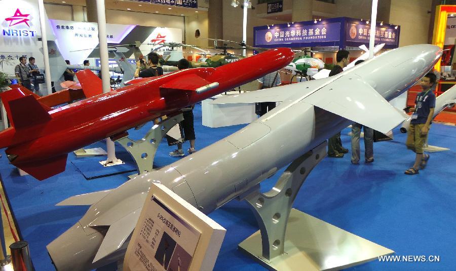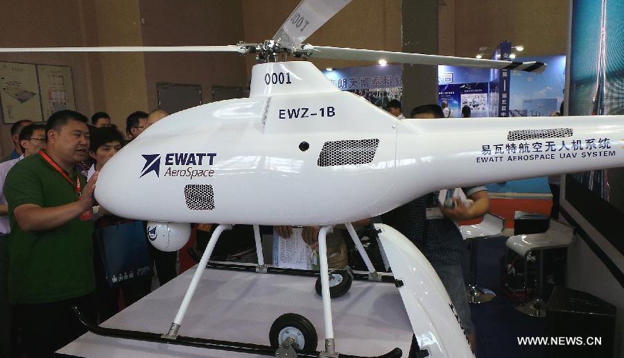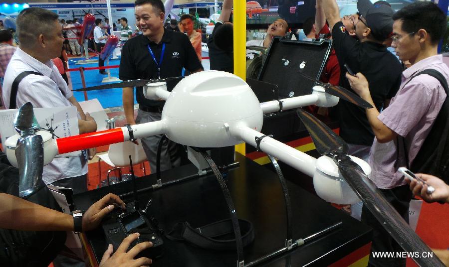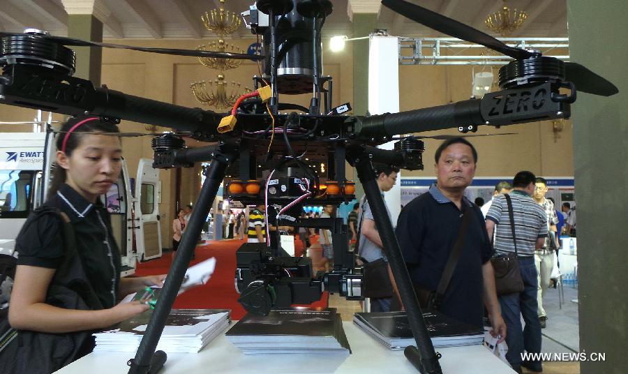 Visitors view an unmanned aerial vehicle (UAV) displayed at a UAV Show in Beijing, capital of China, July 10, 2014. (Xinhua/Li Mingfang)