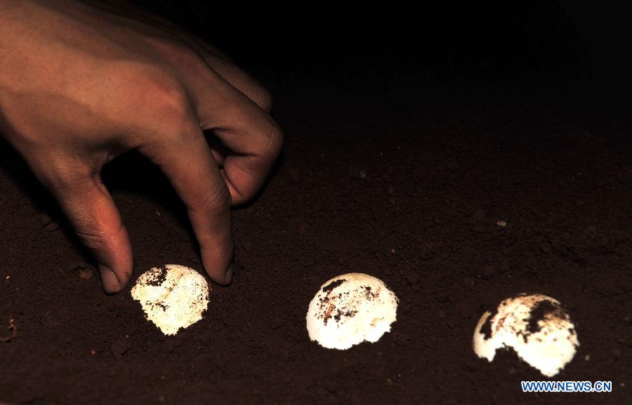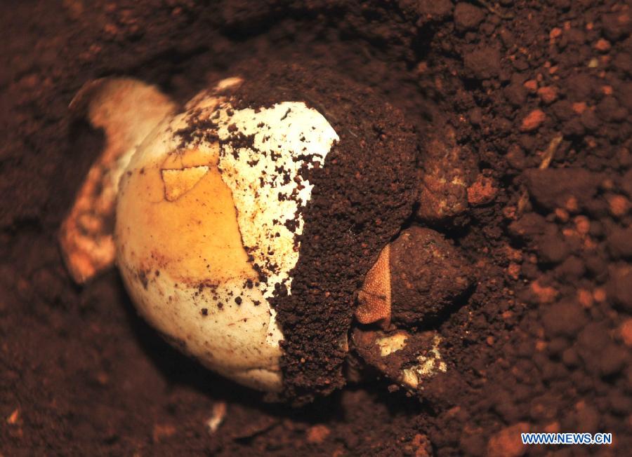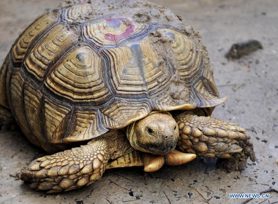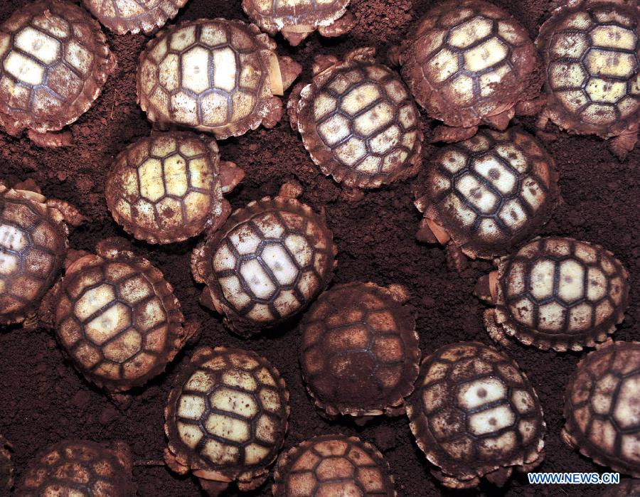 Sulcata tortoise (Centrochelys sulcata) hatchlings are seen at a cultivation center in Wenchang, south China's Hainan Province, July 11, 2014. A chelonian cultivation center in Wenchang has succeeded in hatching over 1,000 Sulcata tortoises. The new hatchlings were given birth to by adults imported from Africa. The sulcata tortoise, which originally lives near the seashores on the southwestern edge of the Sahara desert, is an endangered species on the IUCN Red List. (Xinhua/Jiang Enyu)