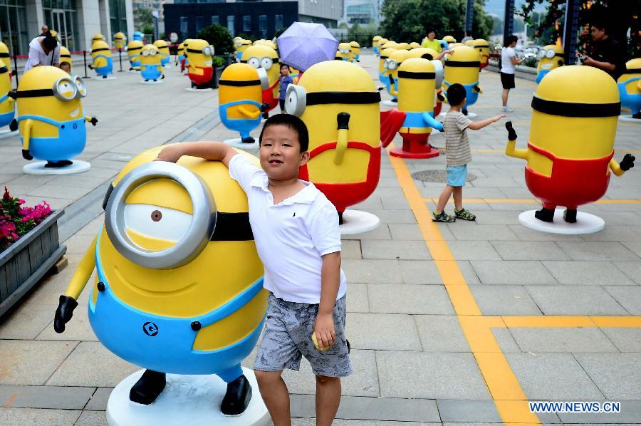Citizens pose for photos with minions figures in Jinan, capital of east China's Shandong Province, July 12, 2014. Figures of minions from movie "Despicable Me" were on display here. (Xinhua/Guo Xulei)