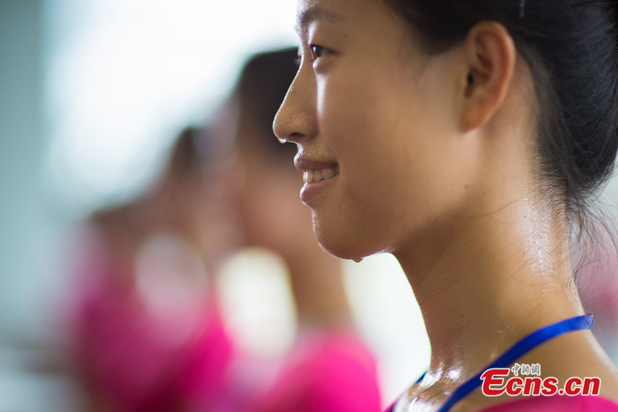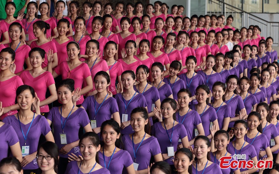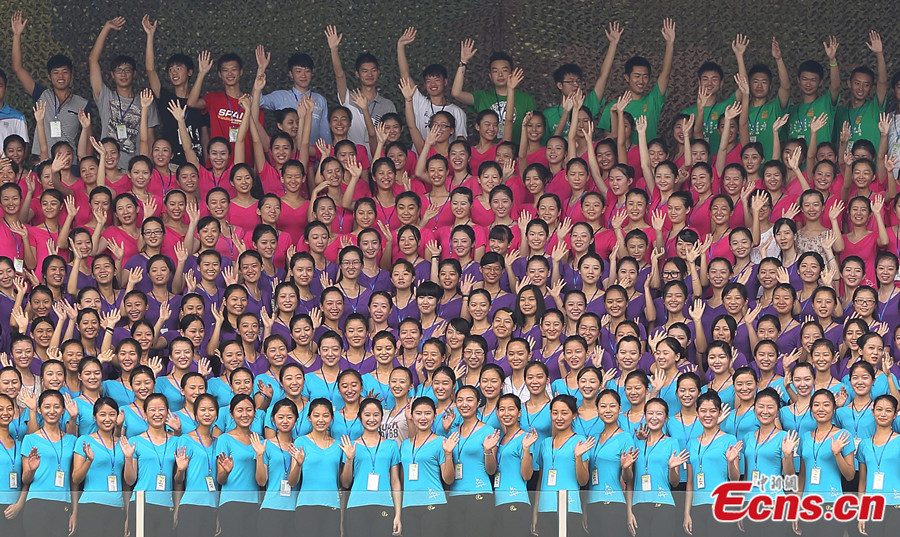 Volunteers for the forthcoming 2014 Nanjing Youth Olympic Games join an etiquette training program held in Nanjing, Jiangsu province on July 13, 2014. Those volunteers have been selected from students of universities and colleges in Nanjing. [Photo: China News Service/ Su Yang]