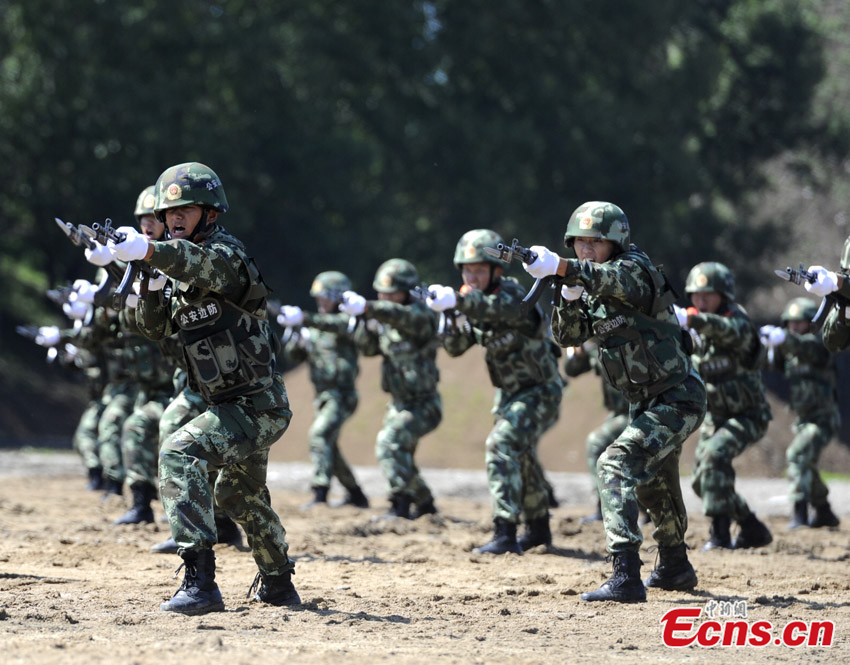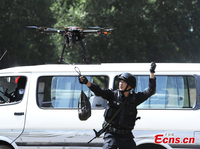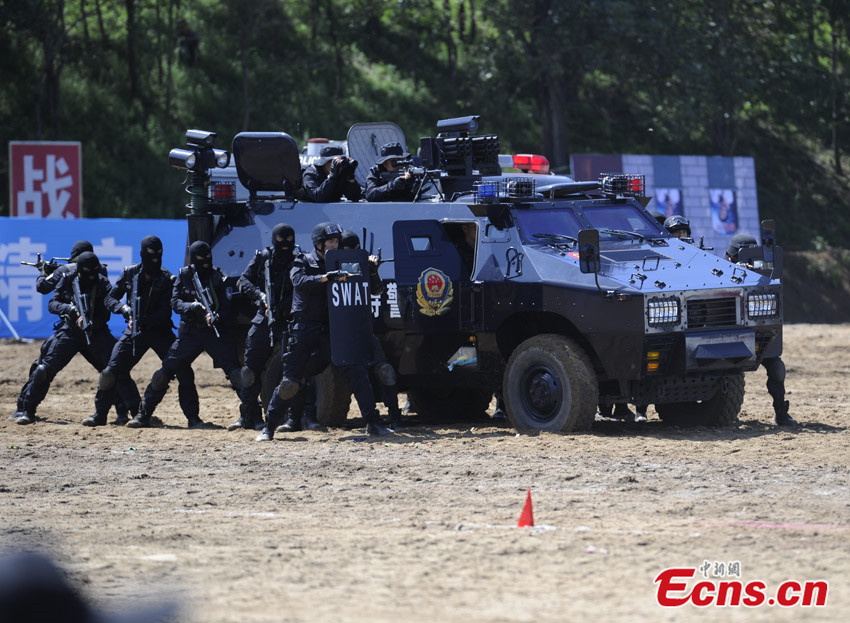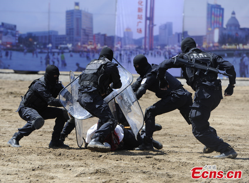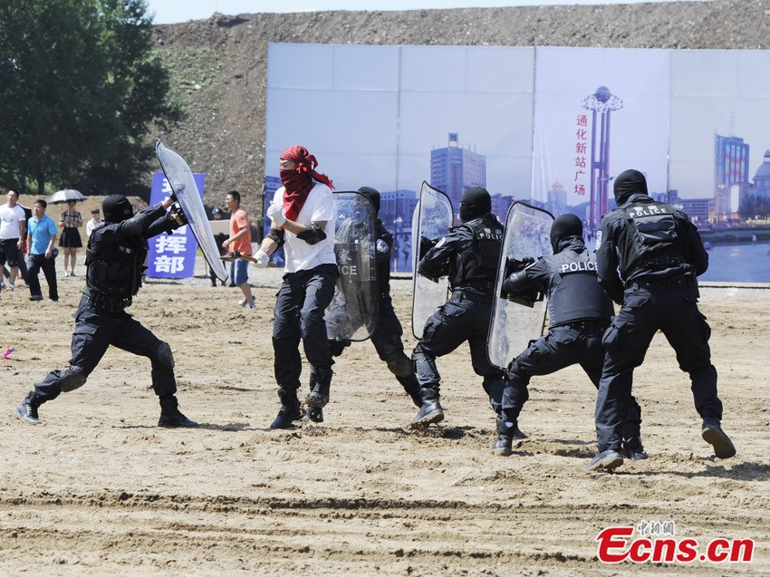 A participant playing the role of an attacker clashes with police officers in a simulation exercise as part of an anti-terrorism drill held in Changchun, Jilin province on July 14, 2014. The drill represents the largest anti-terrorism exercise held in the province. [Photo/ Zhang Yao]